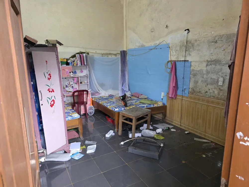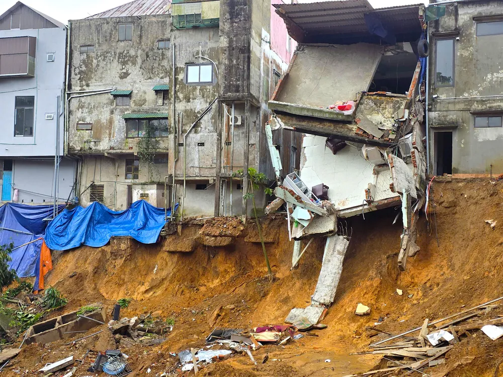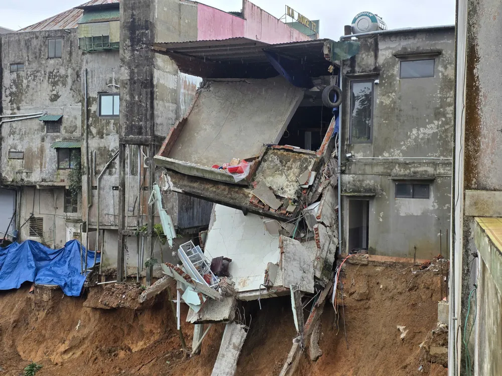 Sàn nhà bị đổ sập, treo lơ lửng giữa không trung. Ảnh: MINH TRƯỜNG