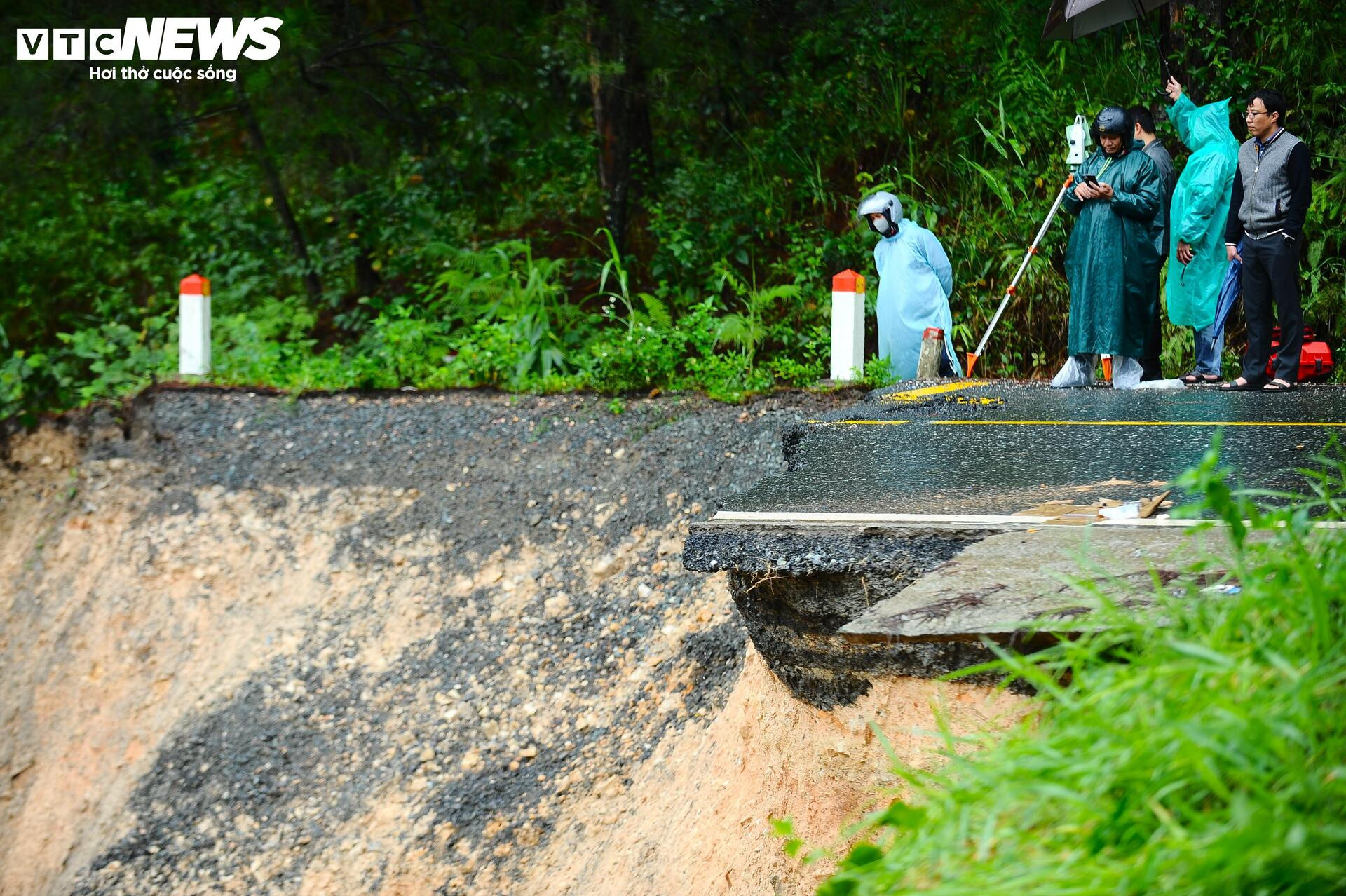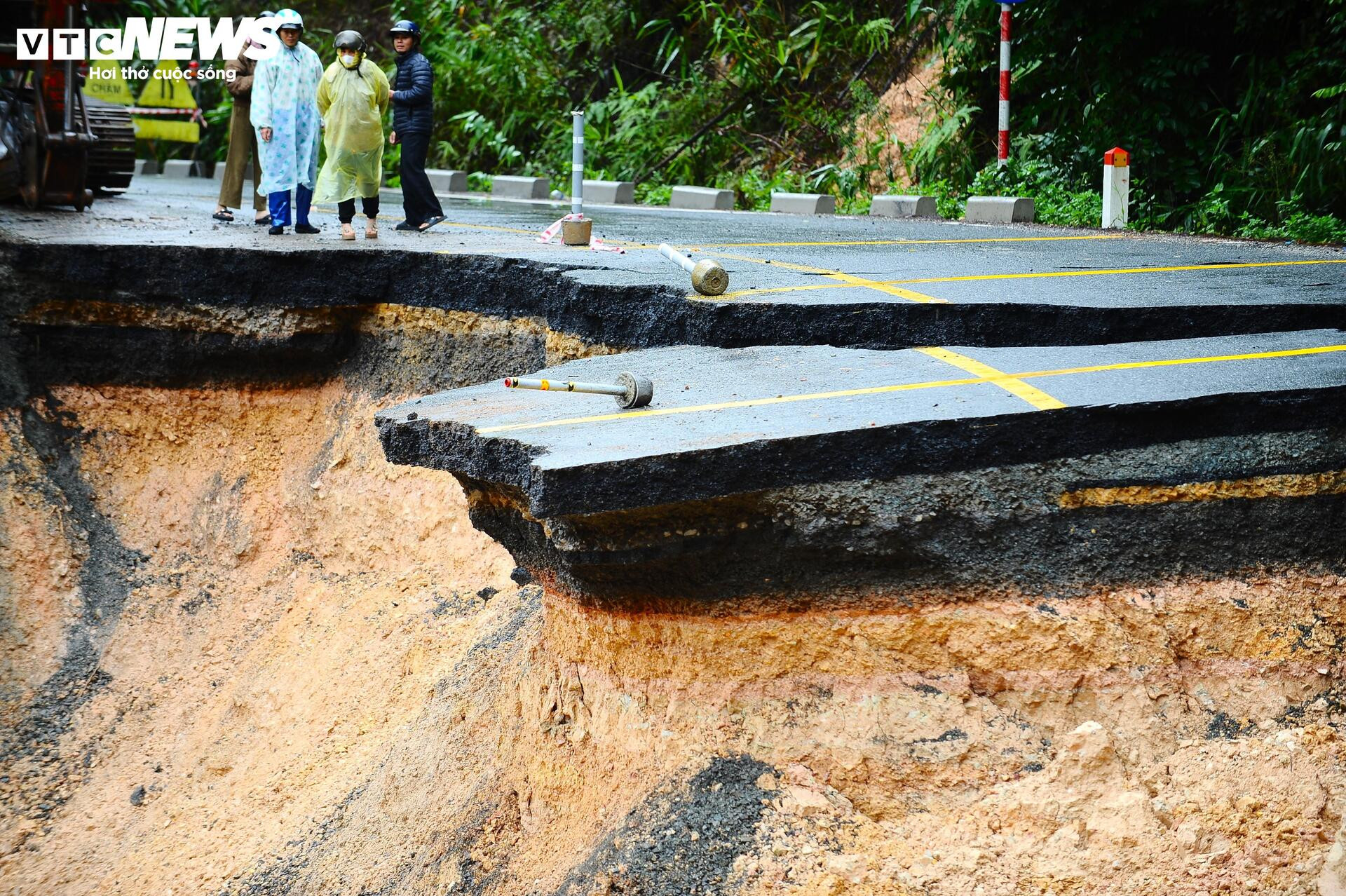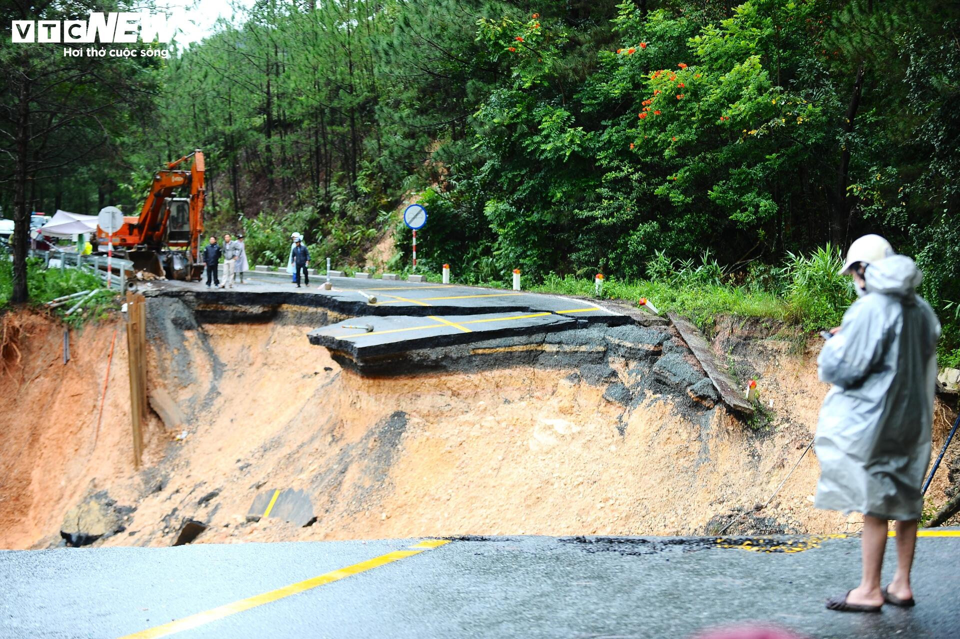 Toàn bộ đất đá bị cuốn trôi xuống dưới, nền đường tan vỡ, hở hàm ếch rộng và sâu.