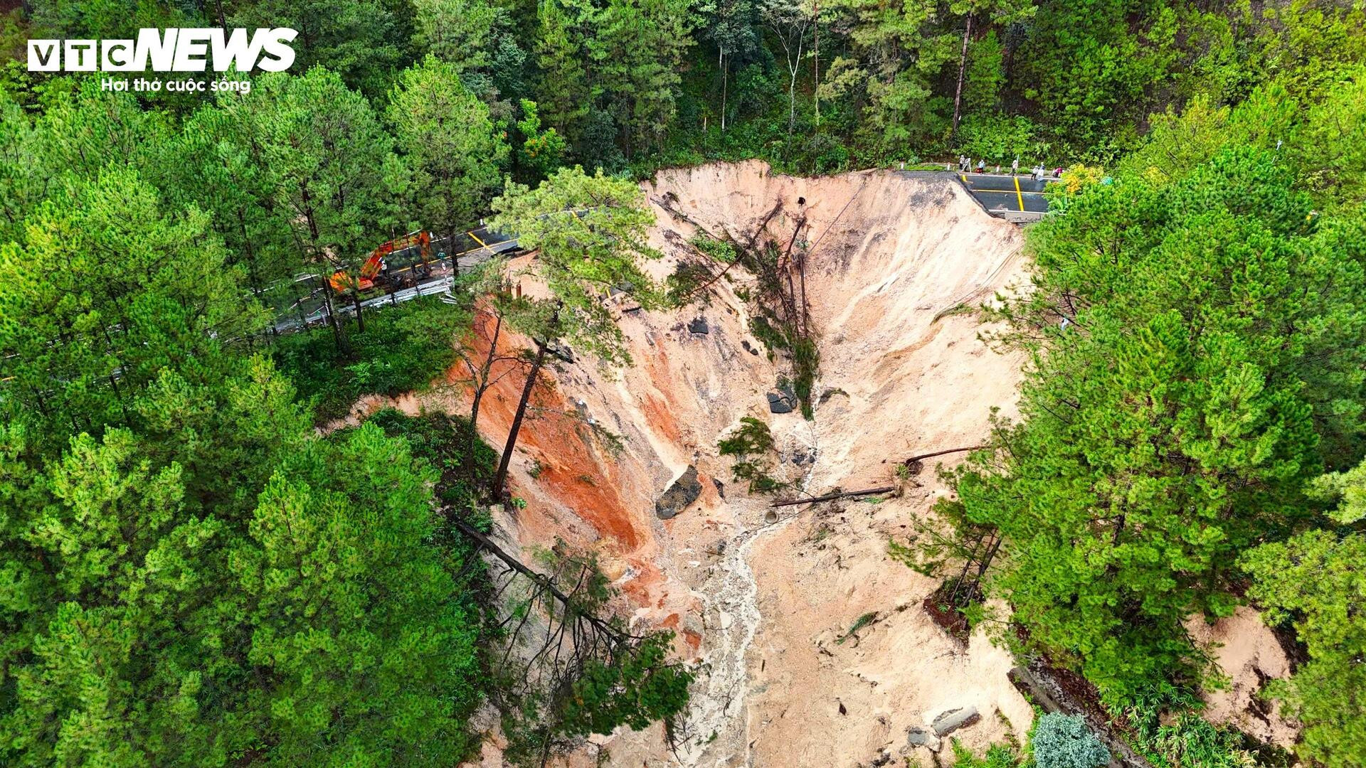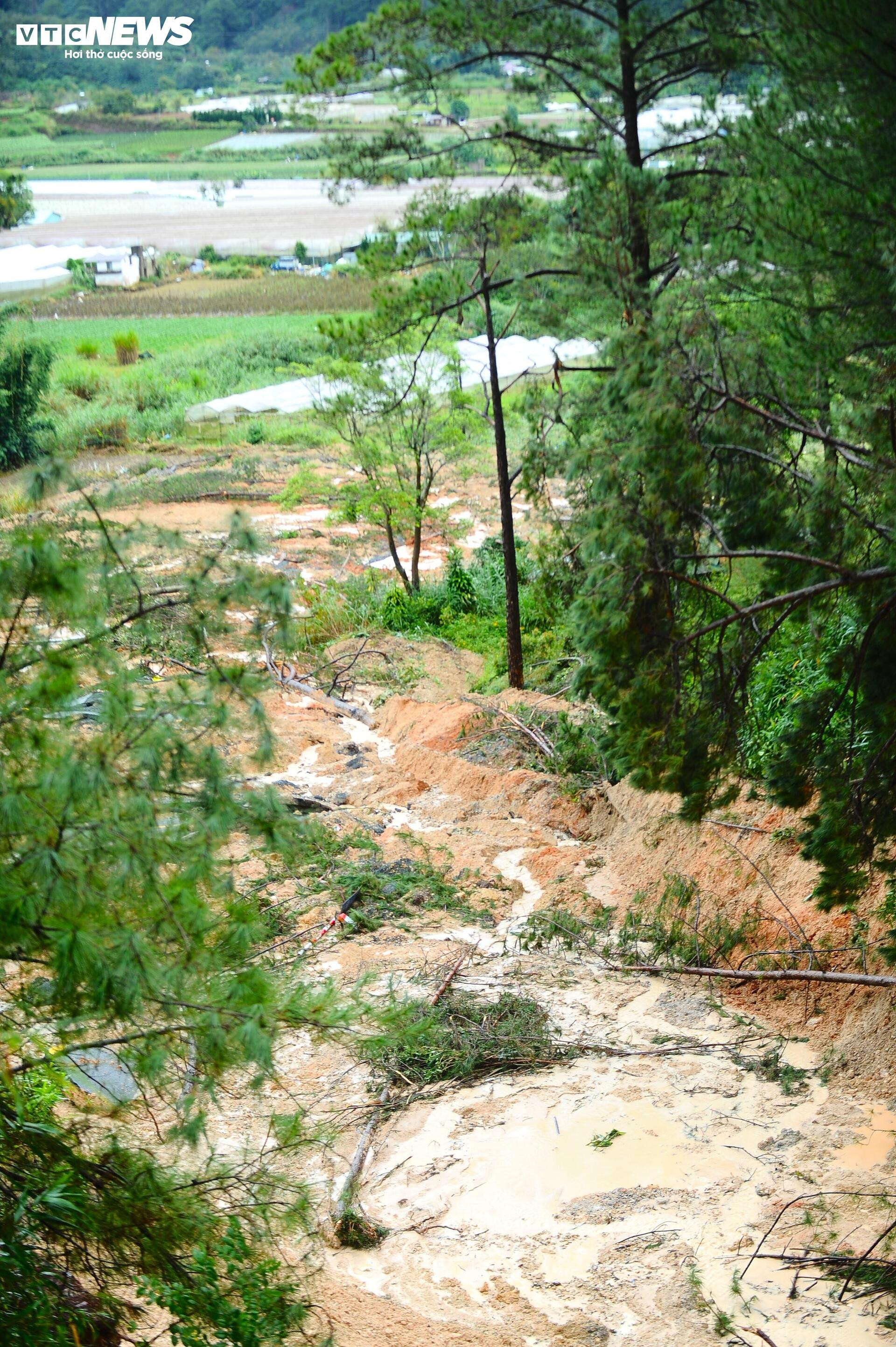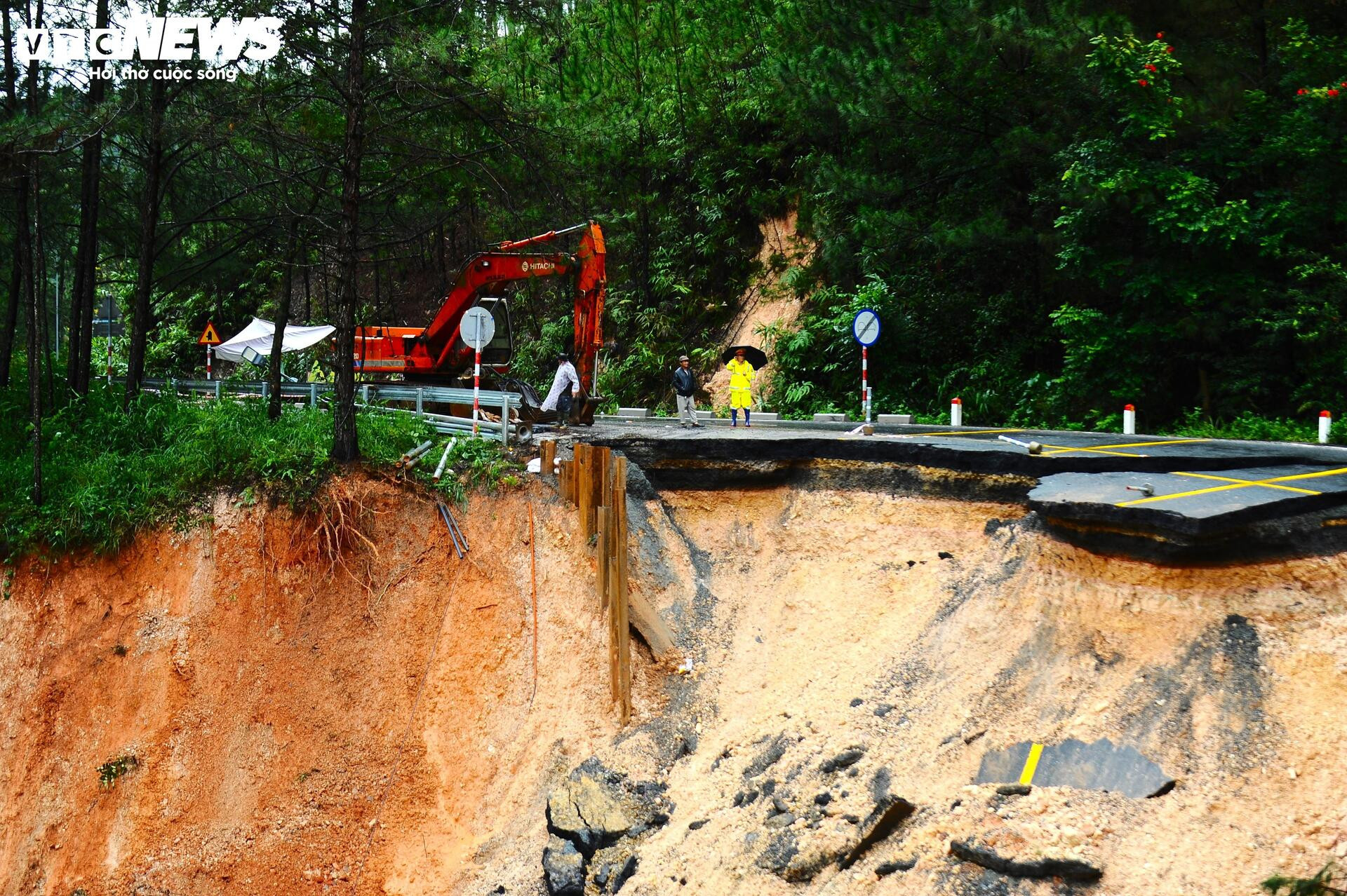 Toàn bộ đất đá bị cuốn trôi xuống dưới, nền đường tan vỡ, hở hàm ếch rộng và sâu.
