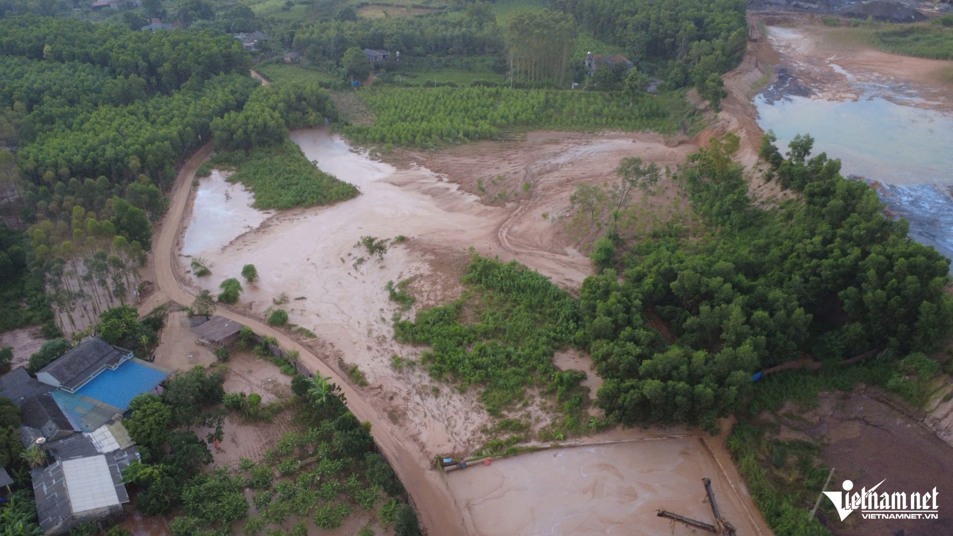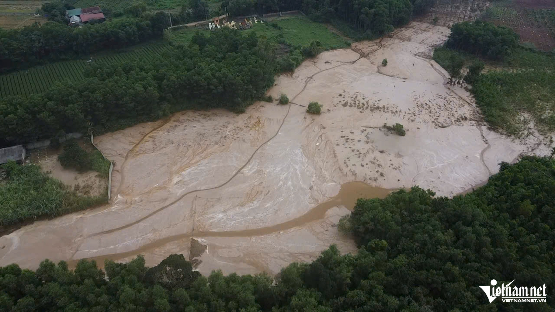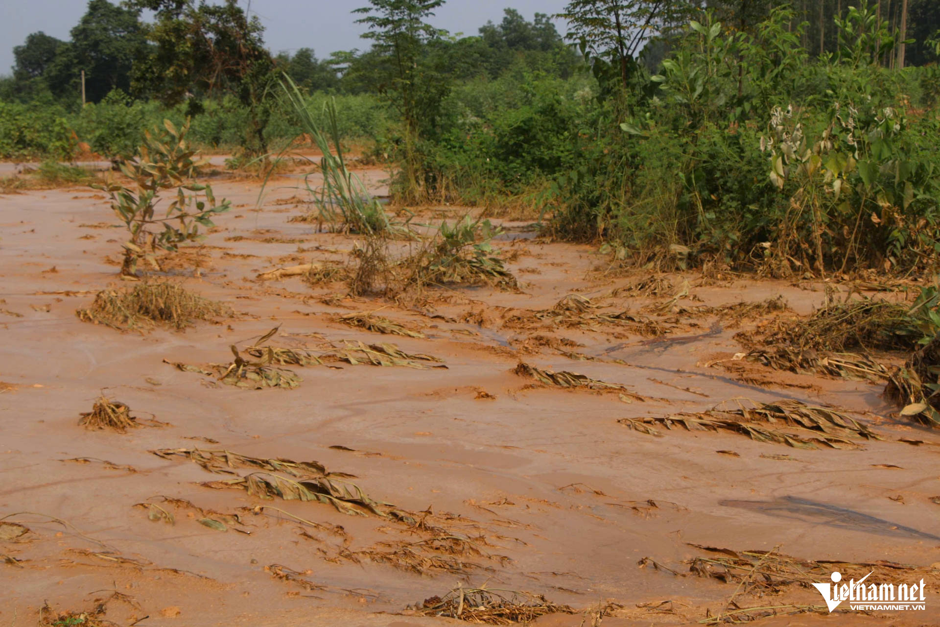 Khối bùn đặc sệt theo dòng chảy tràn xuống khu dân cư, vùi lấp đường đi, sân vườn và ao cá của nhiều hộ dân thuộc hai xóm Gốc Thị và Ao Sen.