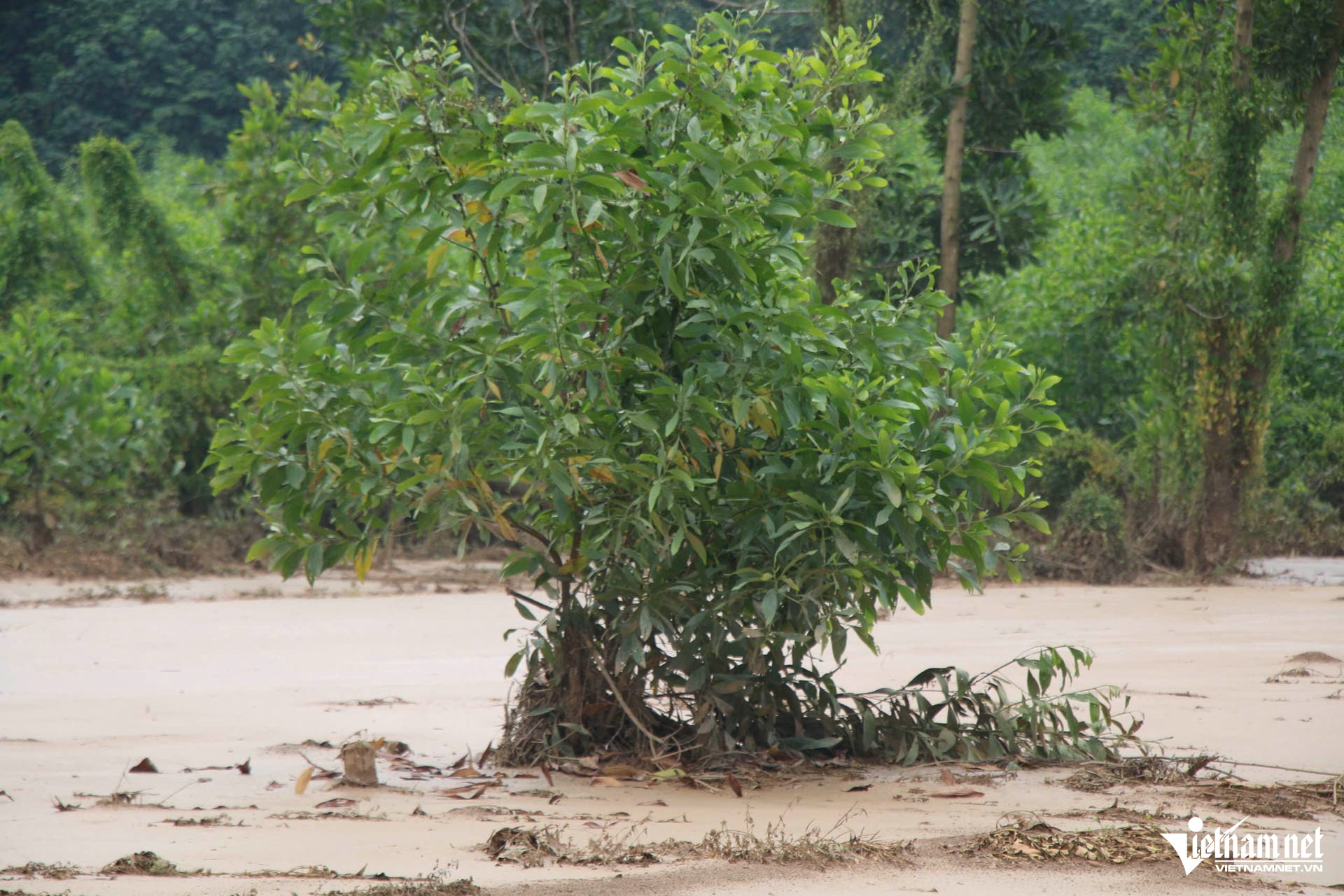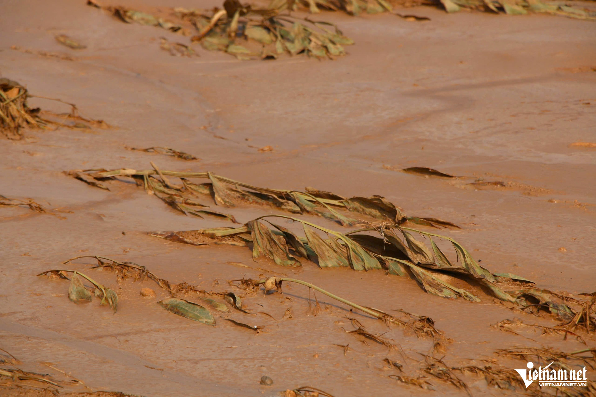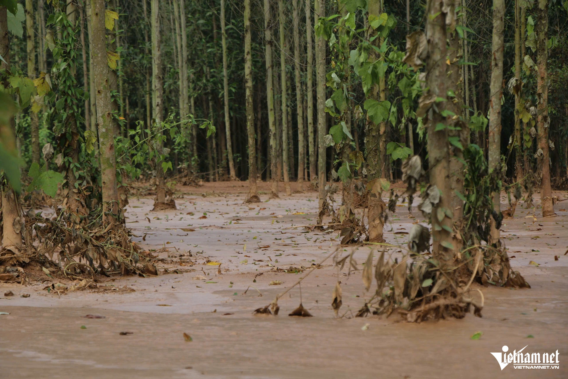 Khối bùn đặc sệt theo dòng chảy tràn xuống khu dân cư, vùi lấp đường đi, sân vườn và ao cá của nhiều hộ dân thuộc hai xóm Gốc Thị và Ao Sen.