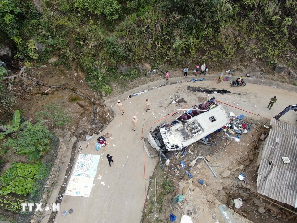 Lực lượng chức năng có mặt tại hiện trường vụ tai nạn. (Ảnh: Đinh Thùy/TTXVN)
