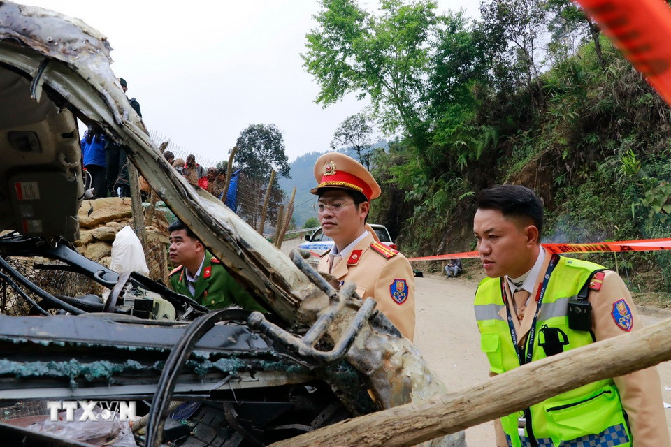 Trung tá Đặng Trần Hoàng, Trưởng Phòng Cảnh sát Giao thông, Công an tỉnh Lào Cai kiểm tra tại hiện trường vụ tai nạn. (Ảnh: Đinh Thùy/TTXVN)