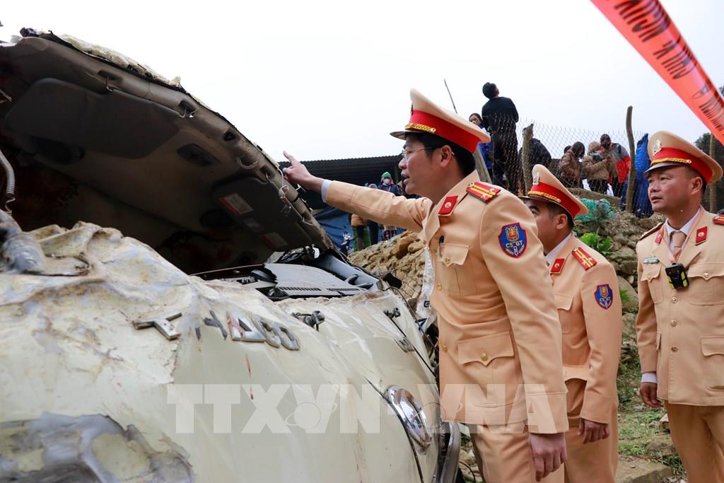 Trung tá Đặng Trần Hoàng, Trưởng Phòng Cảnh sát Giao thông, Công an tỉnh Lào Cai kiểm tra tại hiện trường vụ tai nạn. Ảnh: Đinh Thùy - TTXVN
