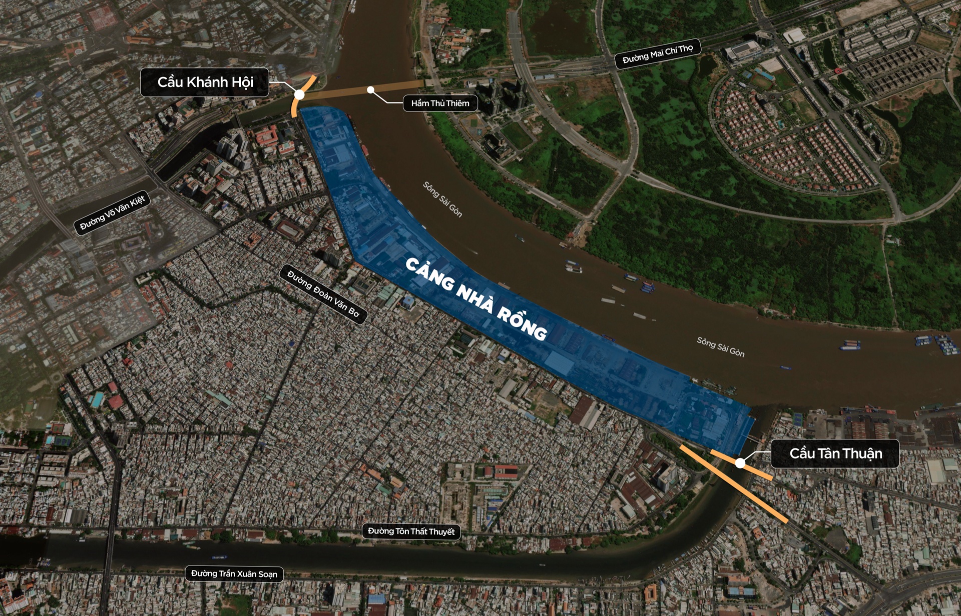 Nhìn từ trên cao, khu vực được quy hoạch mở rộng không gian văn hóa Hồ Chí Minh nằm tại vị trí đắc địa ven sông Sài Gòn, mặt tiền tuyến đường Nguyễn Tất Thành, cửa ngõ kết nối trung tâm với khu nam TP.HCM.