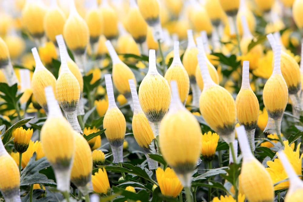 Trên cánh đồng, từng nụ hoa được hai vợ chồng anh Quân bọc túi cẩn thận, trắng xóa cả một vùng, nổi bật giữa nền lá xanh sẫm và màu vàng của hoa cúc tạo nên một bức tranh yên bình ở vựa hoa xứ Thanh.