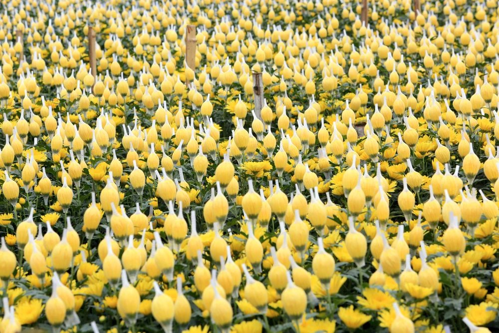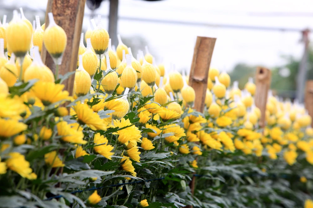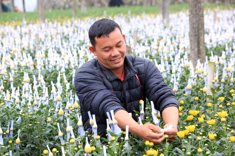 Không khí tất bật lan tỏa khắp làng hoa Đông Cương những ngày này. Trên cánh đồng, người dân liên tục ra vào chăm sóc, bón phân, lồng túi, bó nụ, điều chỉnh ánh sáng để hoa nở đúng thời điểm.