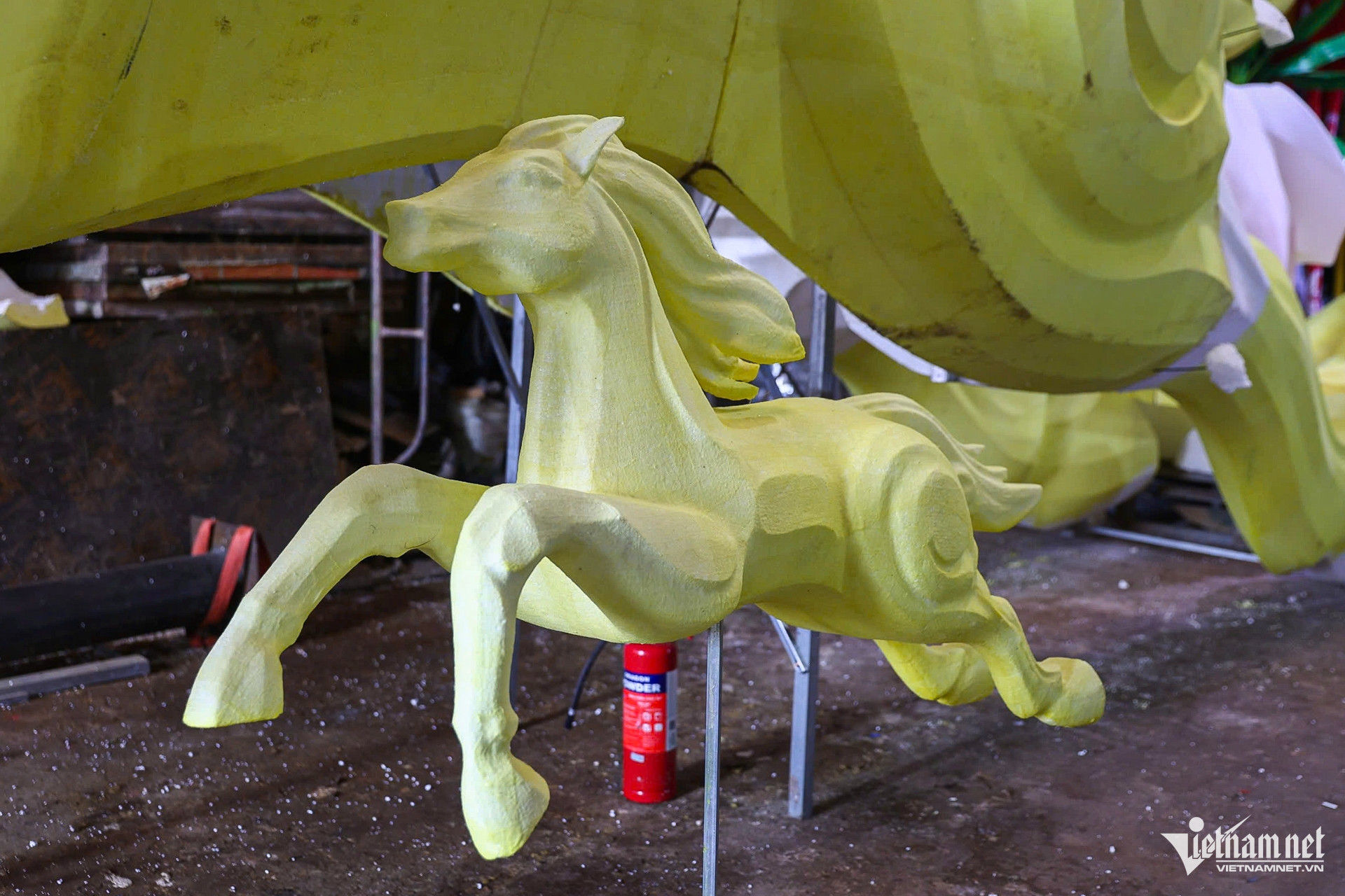 Mô hình linh vật ngựa cao 7m, dài 9m đang được hoàn thiện tại xưởng chế tác của nghệ nhân Văn Tòng (phường An Phú Đông, TPHCM). Mô hình này sẽ được trưng bày tại cổng chào đường hoa Nguyễn Huệ.