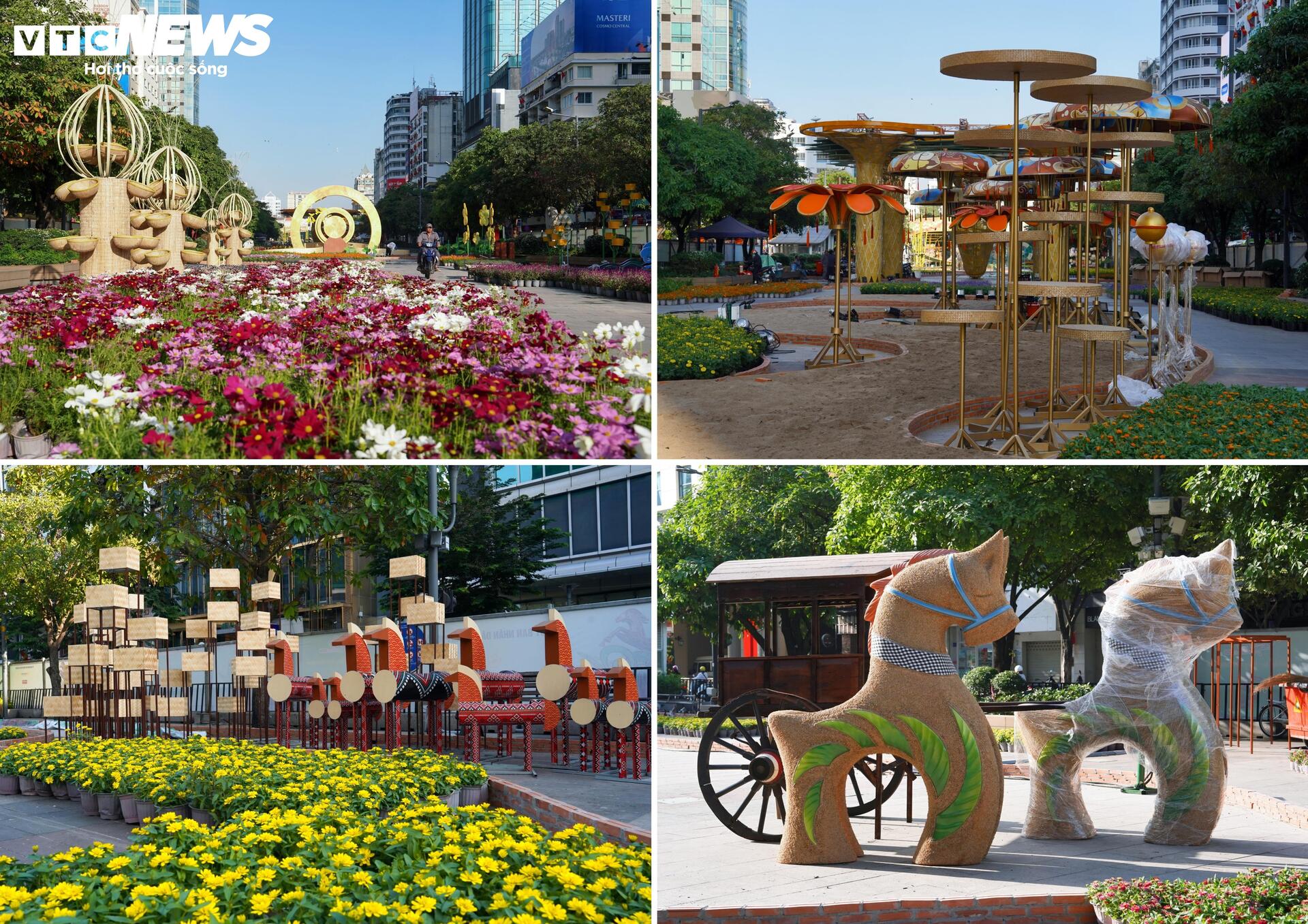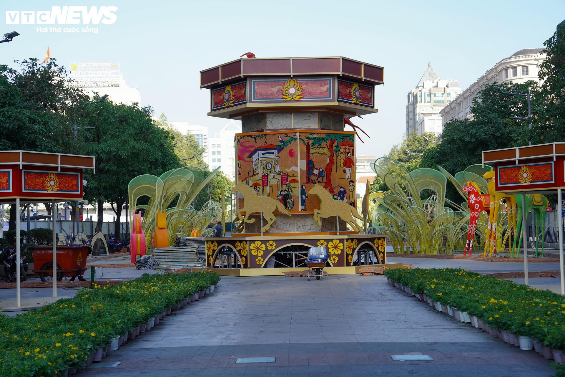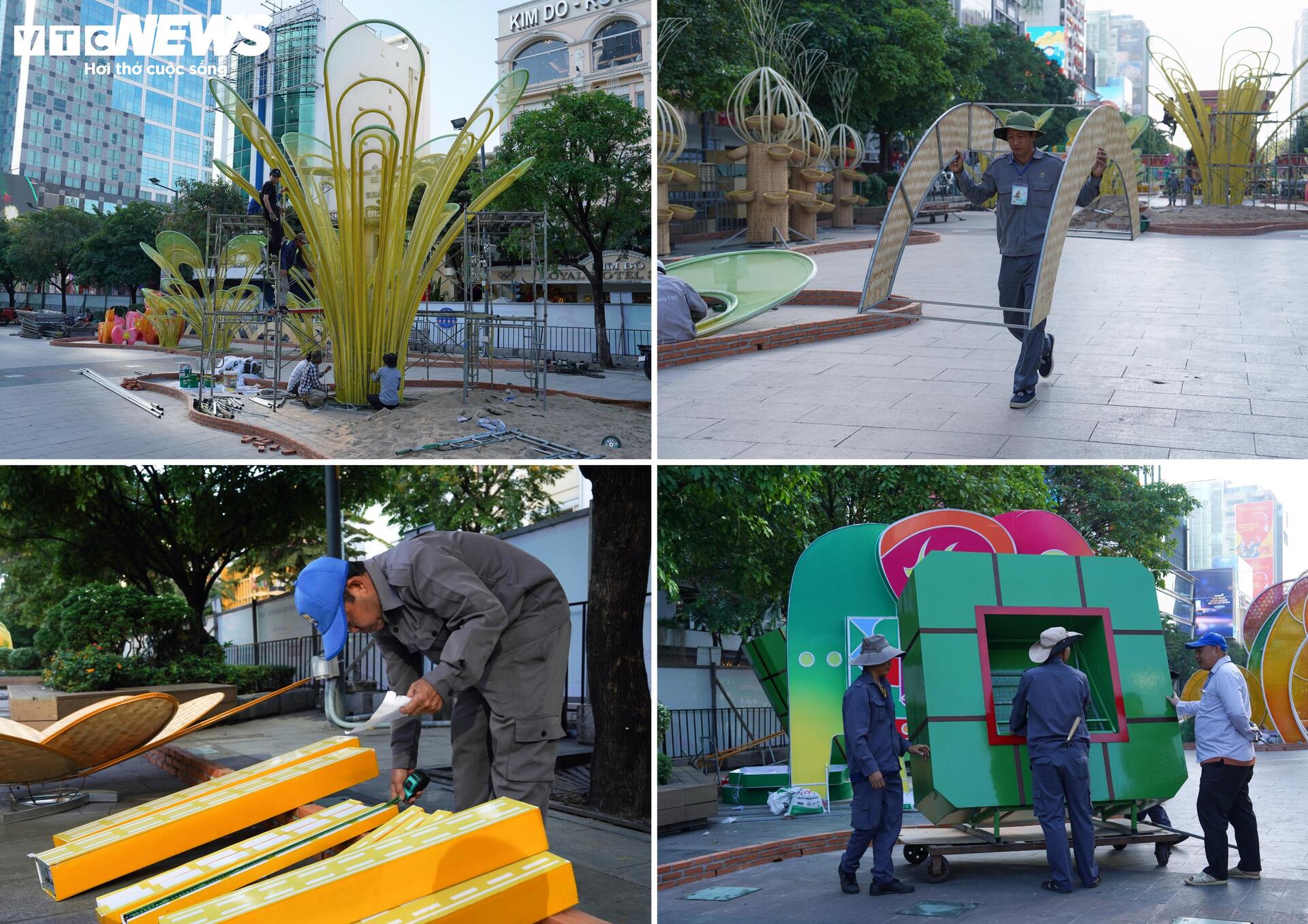 Ghi nhận của PV Báo Điện tử VTC News, ngày 9/2, toàn bộ tuyến phố đi bộ Nguyễn Huệ được rào chắn nhằm phục vụ công tác thi công Đường hoa Tết. Bên trong khu vực này, nhiều nhóm công nhân, kỹ thuật viên và nghệ nhân được bố trí làm việc đồng loạt tại các phân đoạn khác nhau, tập trung hoàn thiện những hạng mục quan trọng.
