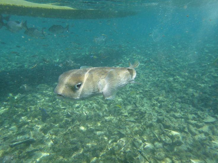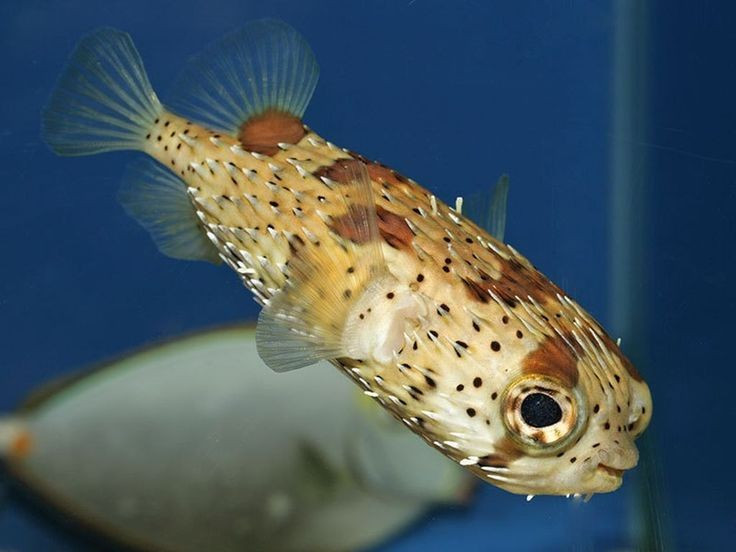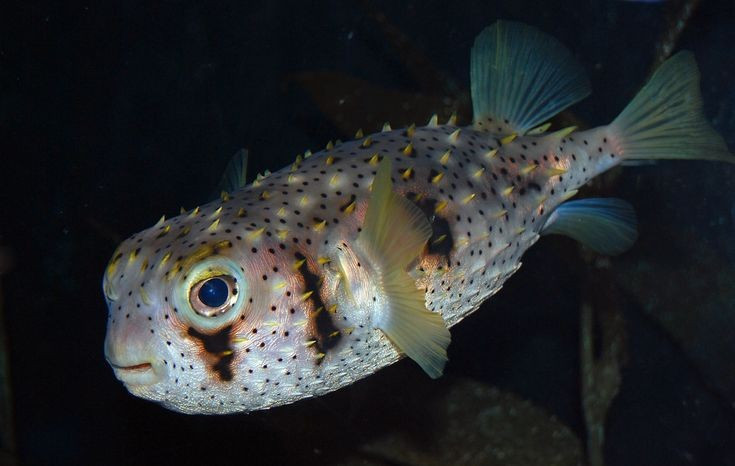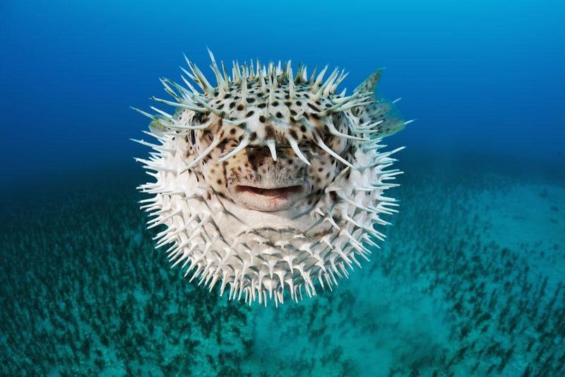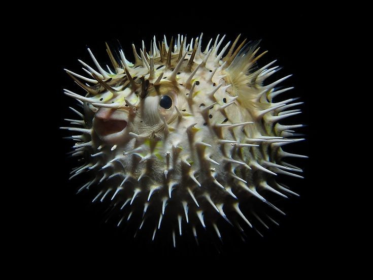 Khả năng phồng căng toàn thân khi gặp nguy hiểm. Cá nóc nhím chấm đen có thể hút nước (hoặc không khí) để biến cơ thể thành quả cầu gai khổng lồ, làm kẻ săn mồi chùn bước. Ảnh: Pinterest.