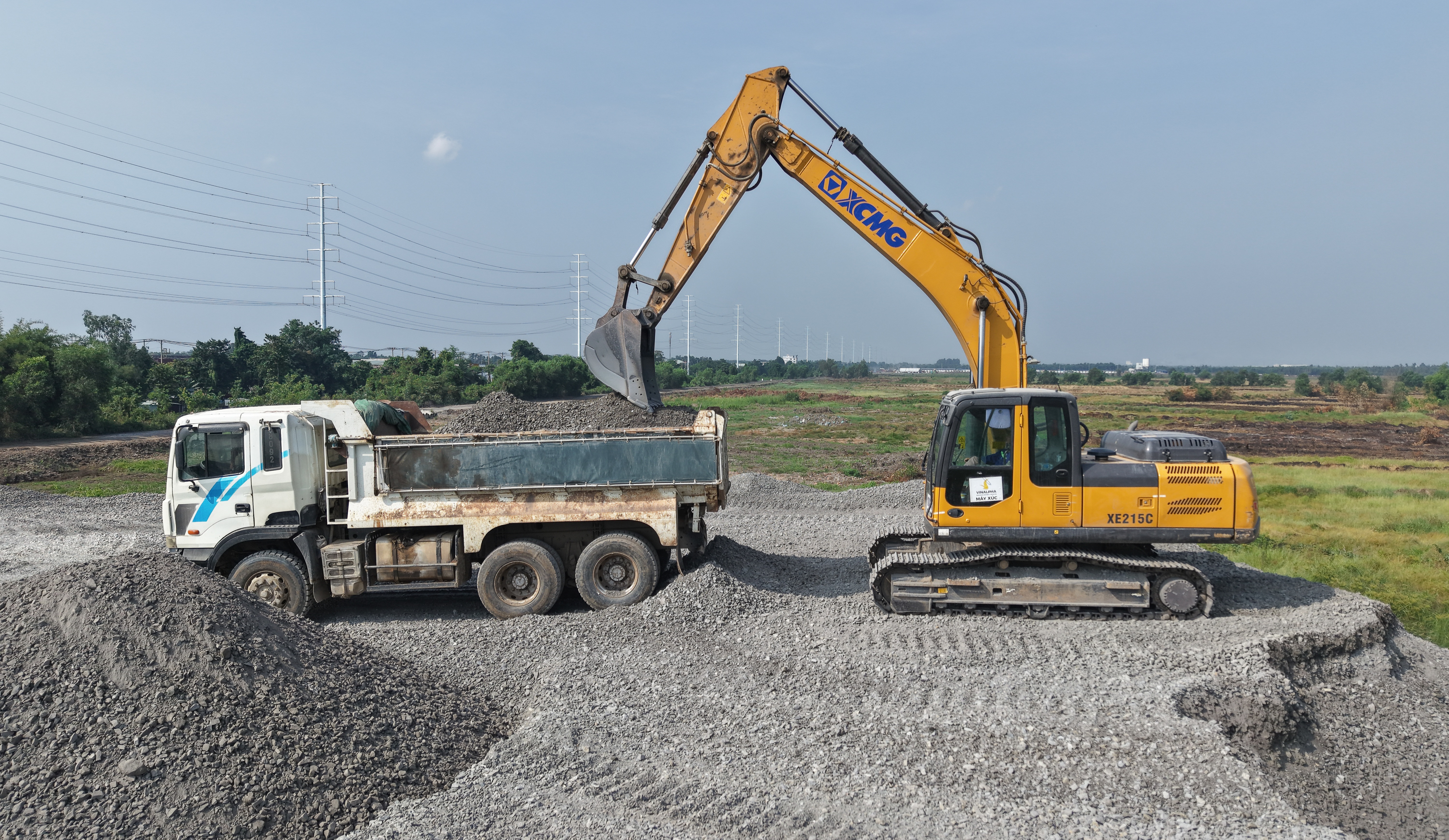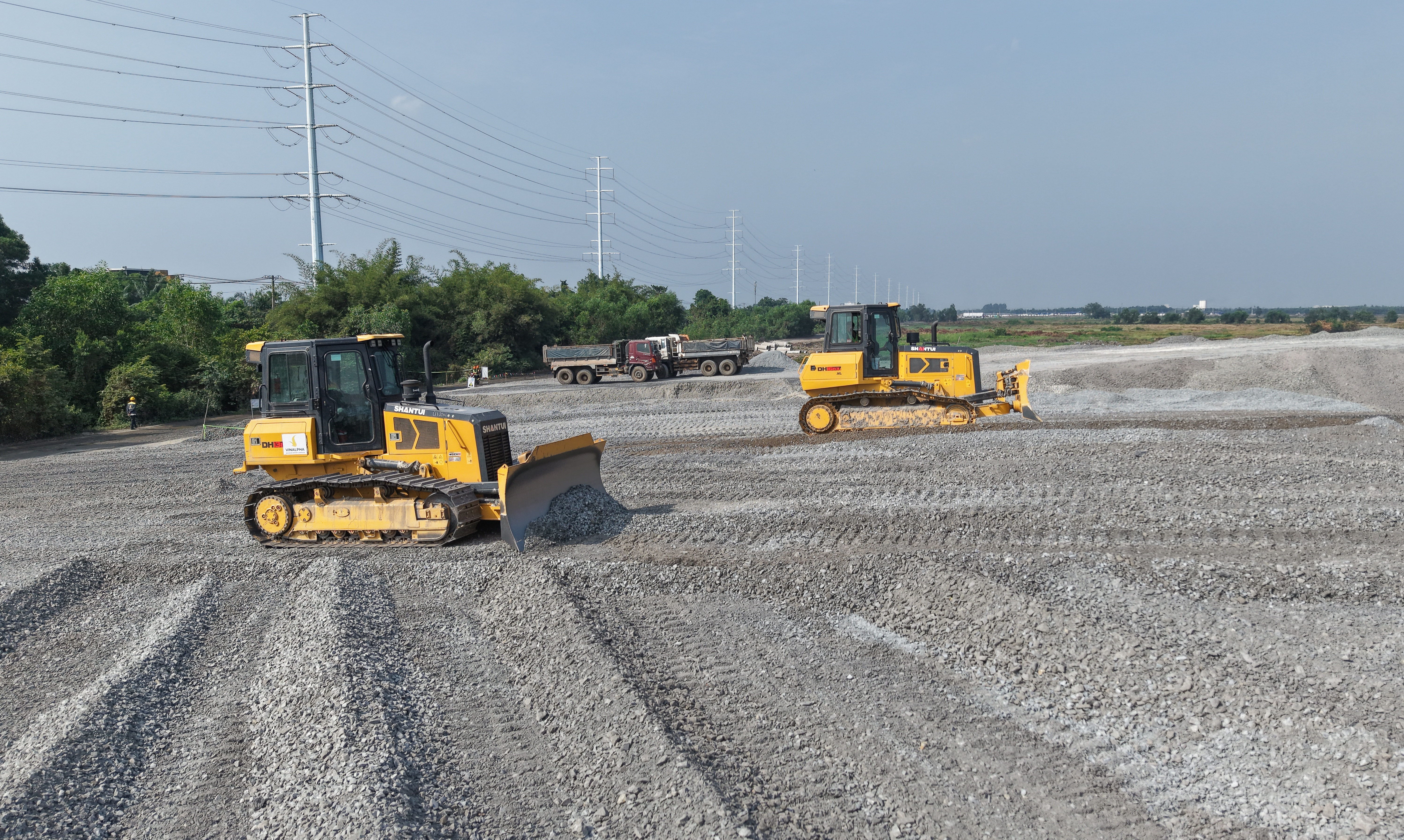 Nhiều công nhân cùng các phương tiện xây dựng tất bật xử lý mặt bằng khu đất trước ngày khởi công.
