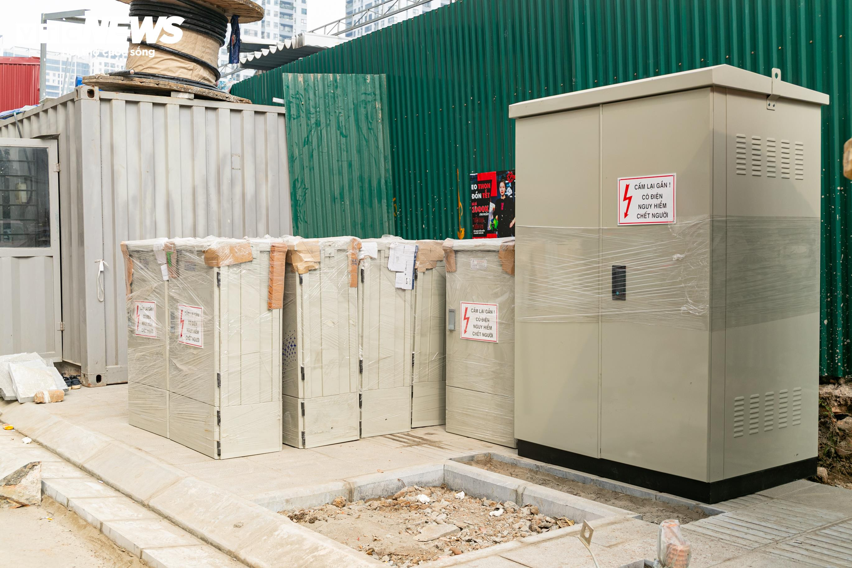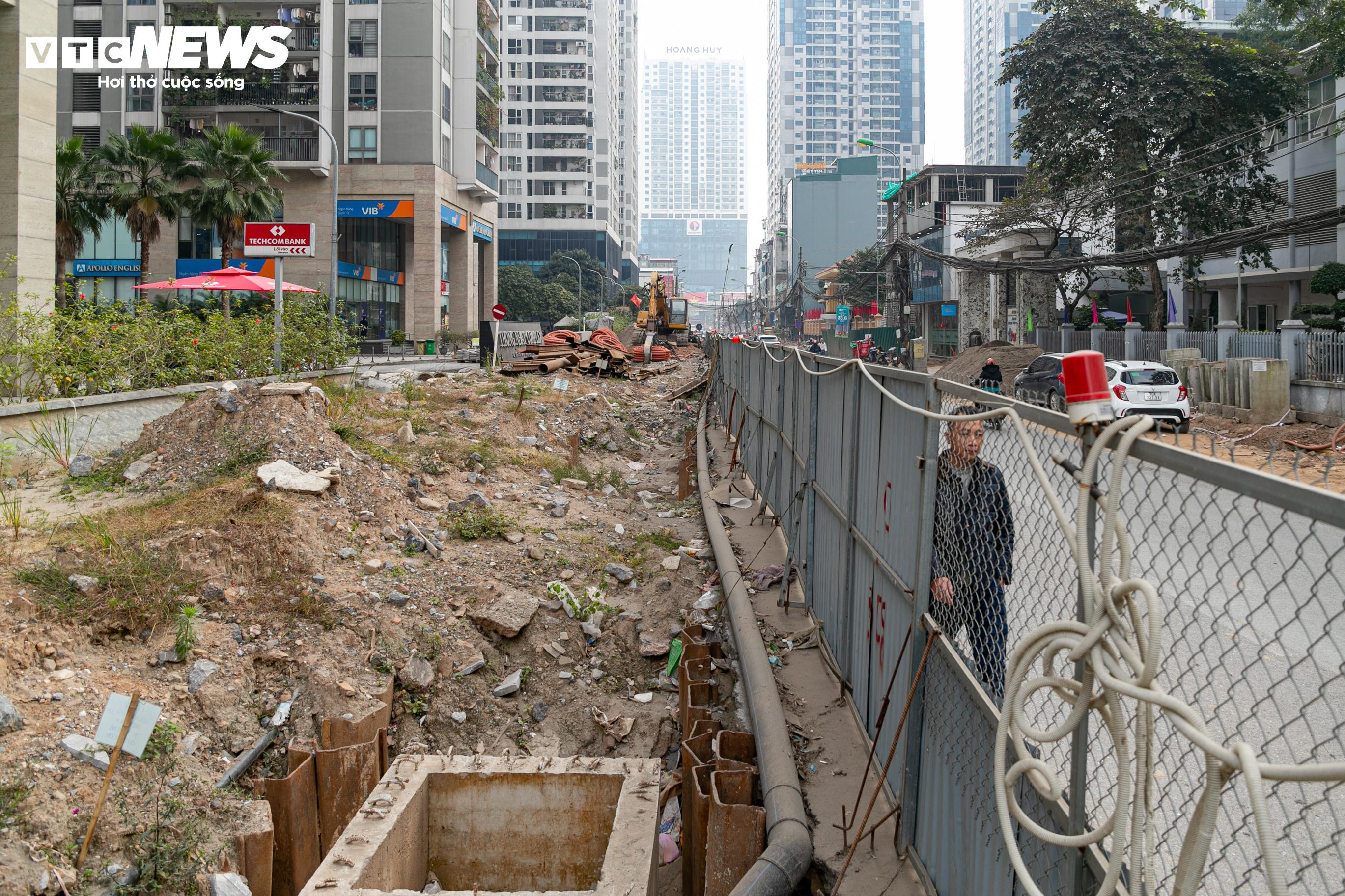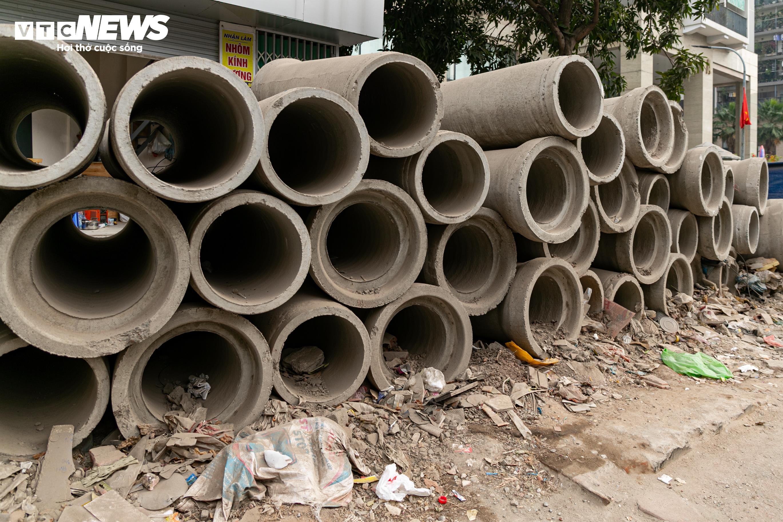 Vỉa hè ngổn ngang, trong khi hạ tầng kỹ thuật phía trái tuyến chưa được di dời.