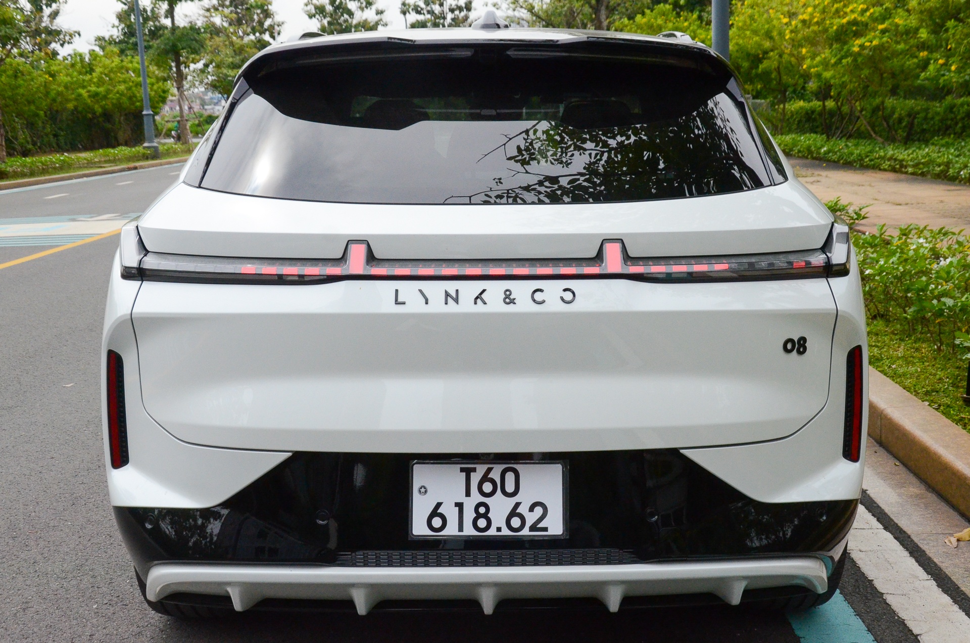 Đuôi xe Lynk & Co 08 sở hữu thiết kế gọn gàng, điểm nhấn là cụm đèn hậu Penetrating Energy Cube chạy ngang xuyên suốt.