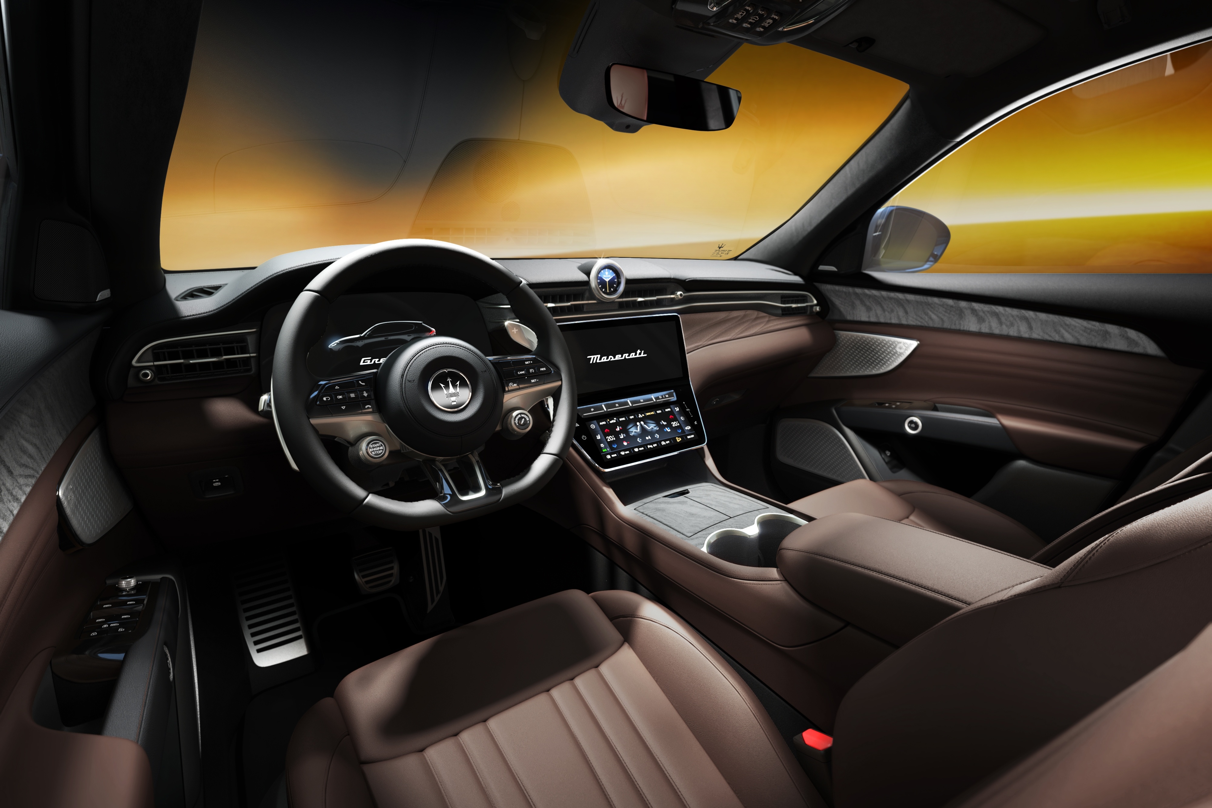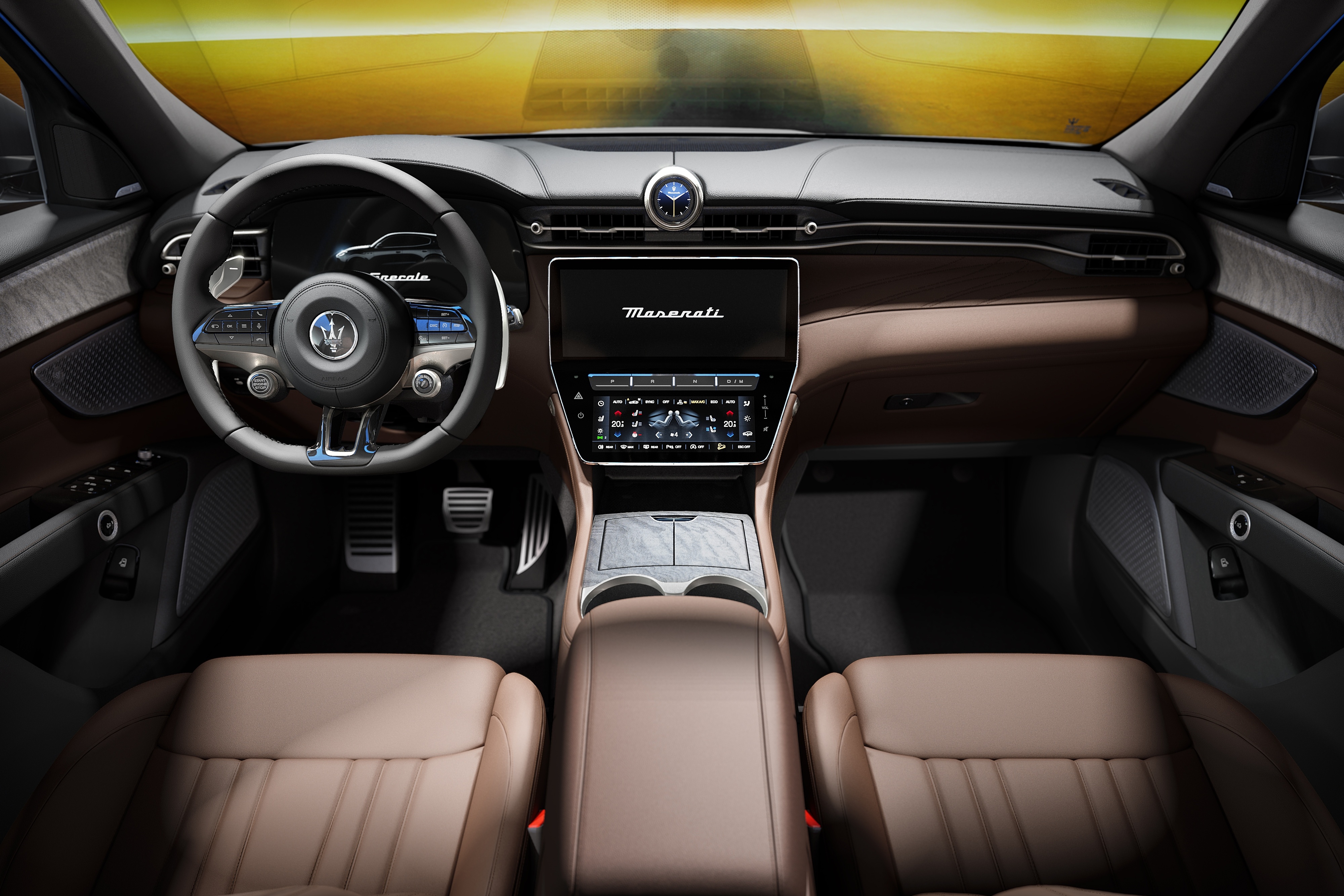 Nội thất của Maserati Grecale Lumina Blu tôn vinh tay nghề thủ công Italy và tinh thần thiết kế của Maserati, nổi bật với ốp trang trí gỗ "burl" với các vân tự nhiên độc đáo.