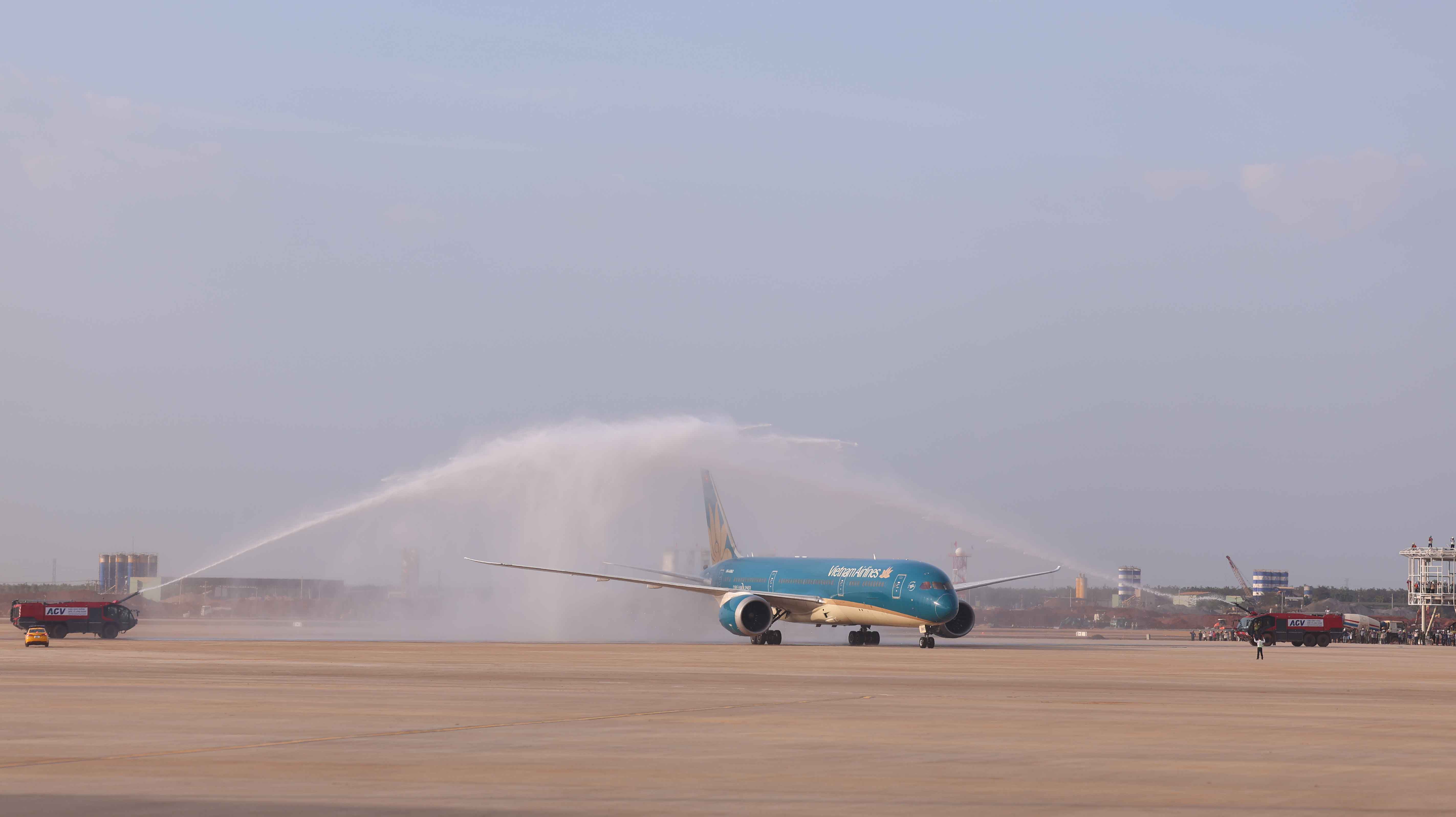 Nghi thức phun nước chào mừng chuyến bay kỹ thuật đầu tiên hạ cánh xuống sân bay quốc tế Long Thành chiều 15/12.