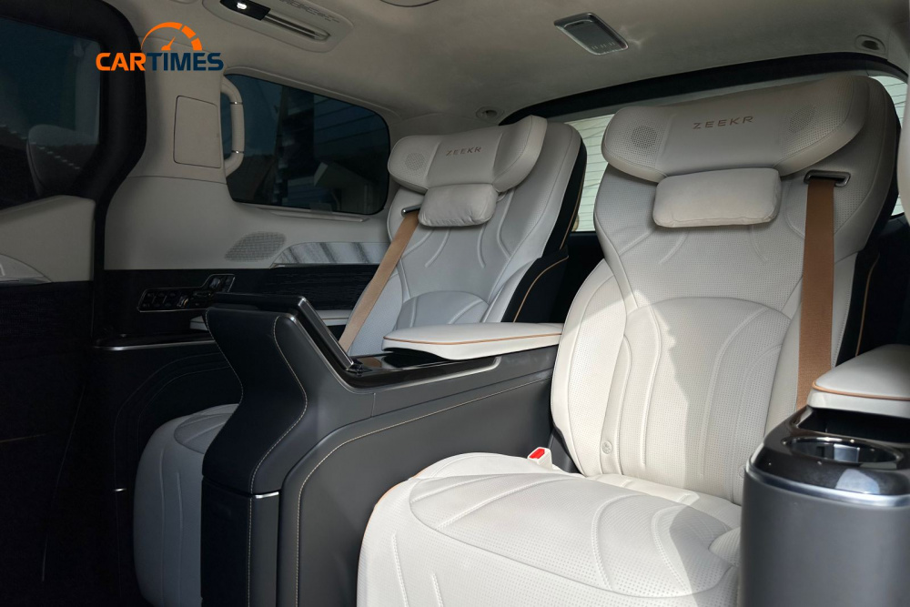 Nội thất Zeekr 009 là điểm nhấn lớn nhất, mang đến trải nghiệm xa xỉ như một "phòng khách di động". Cabin được bọc da Nappa cao cấp, với cấu hình ghế 2+2+2 (hoặc 2+3+2 tùy phiên bản), nơi hàng ghế giữa có thể chỉnh điện 14 hướng, tích hợp sưởi ấm, làm mát và massage. Hàng ghế sau còn có bàn gấp, tủ lạnh mini, và màn hình giải trí 17 inch.