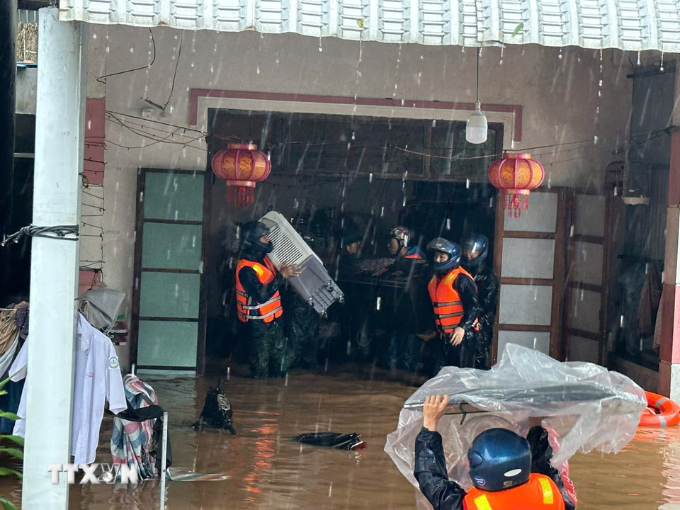 Lực lượng chức năng xã Xuân Cảnh, Đắk Lắk cứu nạn người dân ở khu vực ngập sâu. (Ảnh: TTXVN phát)