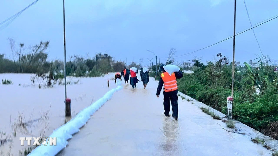 Lực lượng bộ đội Đồn Biên phòng Xuân Đài ứng cứu người dân trên địa bàn quản lý. (Ảnh: TTXVN phát)