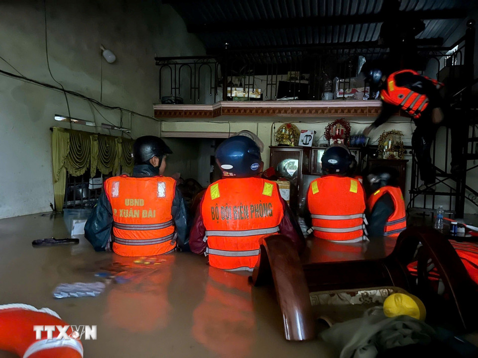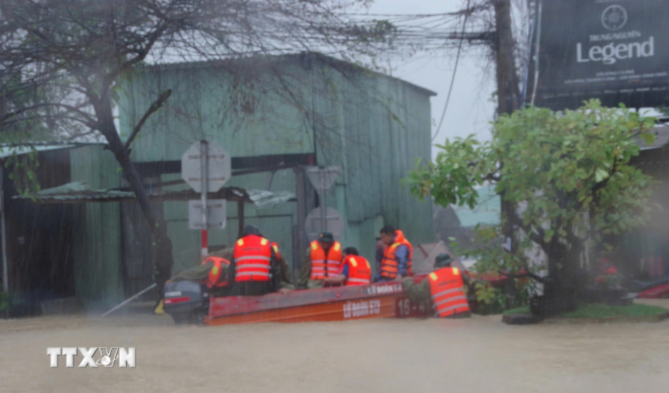 Bộ đội Biên phòng Đồn Biên phòng Xuân Đài ứng cứu người dân ở khu vực ngập lụt. (Ảnh: TTXVN phát)