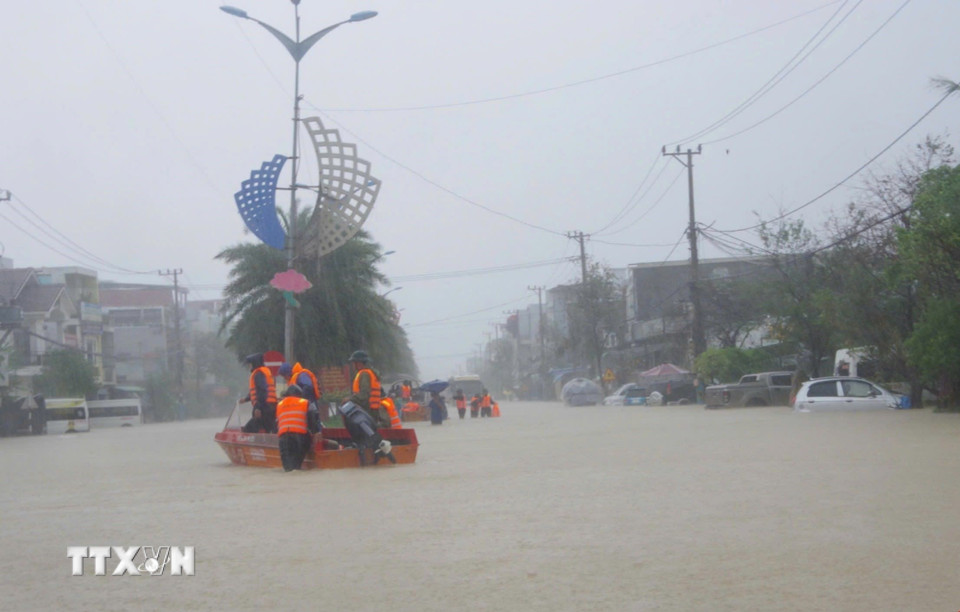Lực lượng chức năng sơ tán người dân khu vực bị ngập lụt ở xã Hòa Trí (Khánh Hòa). (Ảnh: TTXVN phát)