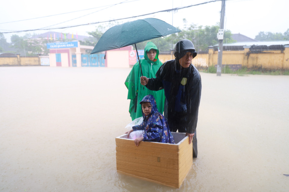 Người dân xã Diên Điền (Khánh Hòa) khẩn trương di chuyển tránh lụt. (Ảnh: Nguyễn Thành/TTXVN)