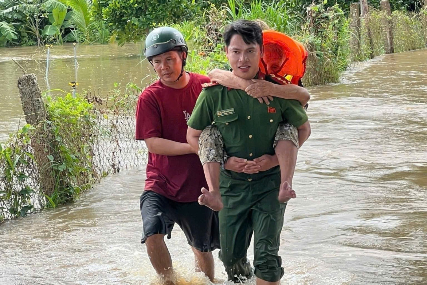 Công an xã Hàm Liêm hỗ trợ đưa người già đến khu vực an toàn.
