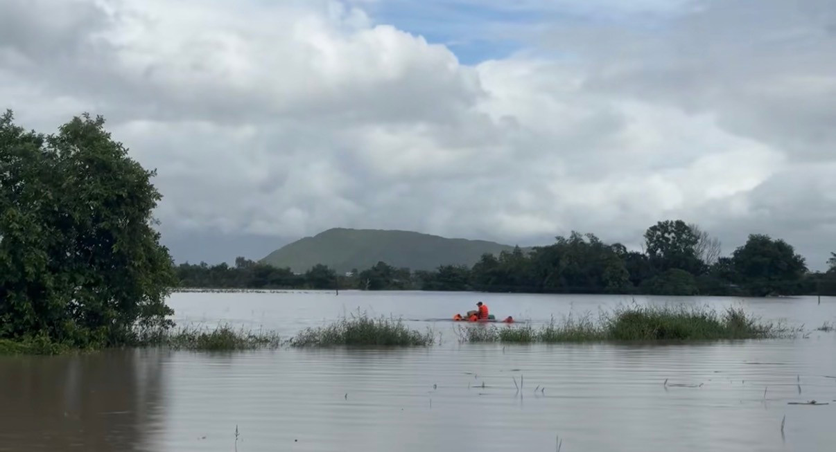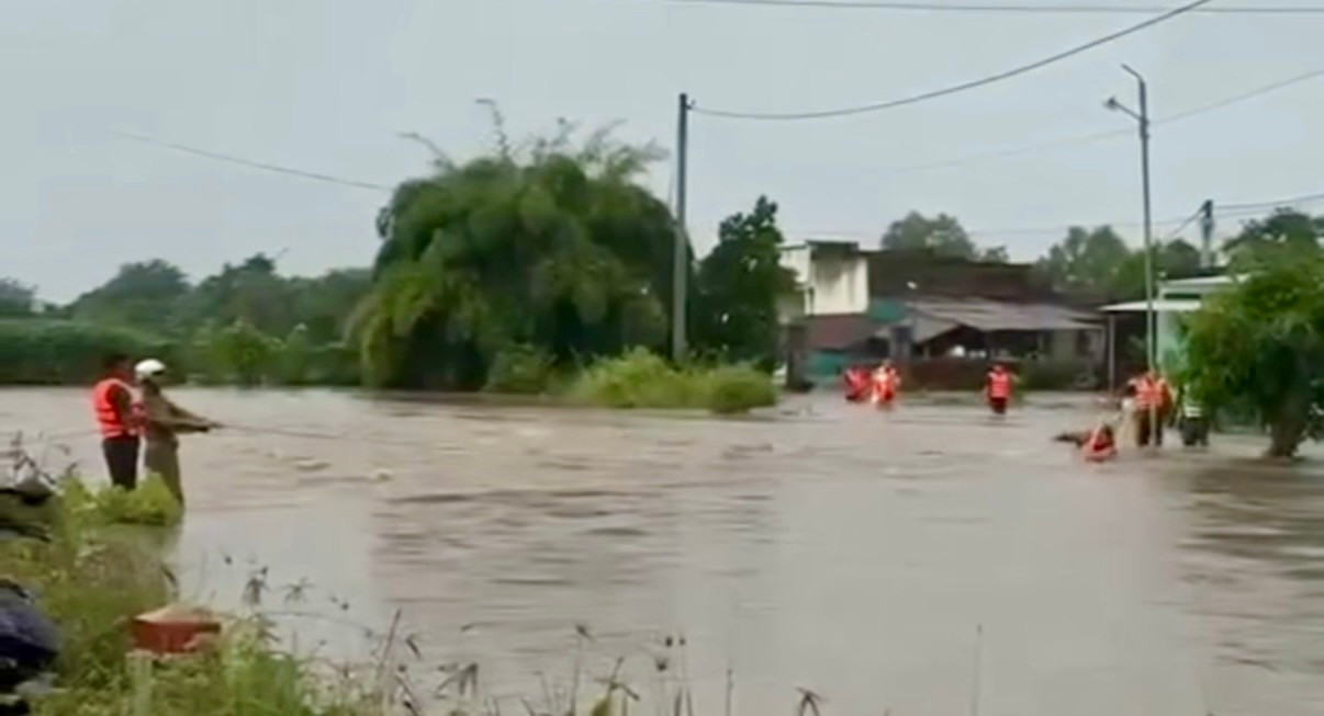 Lực lượng chức năng xã Hàm Thuận tiếp cận, hỗ trợ di dời người dân ra khỏi khu vực nguy hiểm.