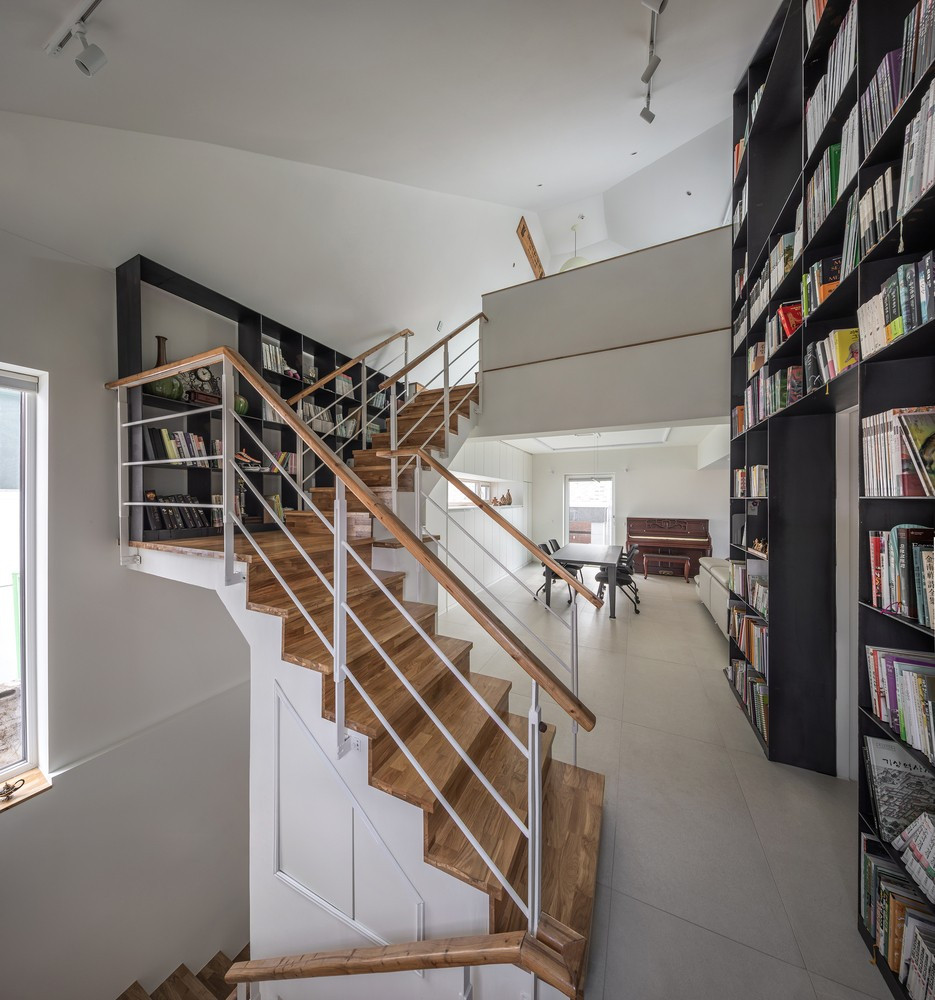 Hệ tủ sách lớn cao kịch trần chạy dọc theo trục cầu thang, tận dụng tối đa chiều cao. Ảnh: Architecture Studio YEIN