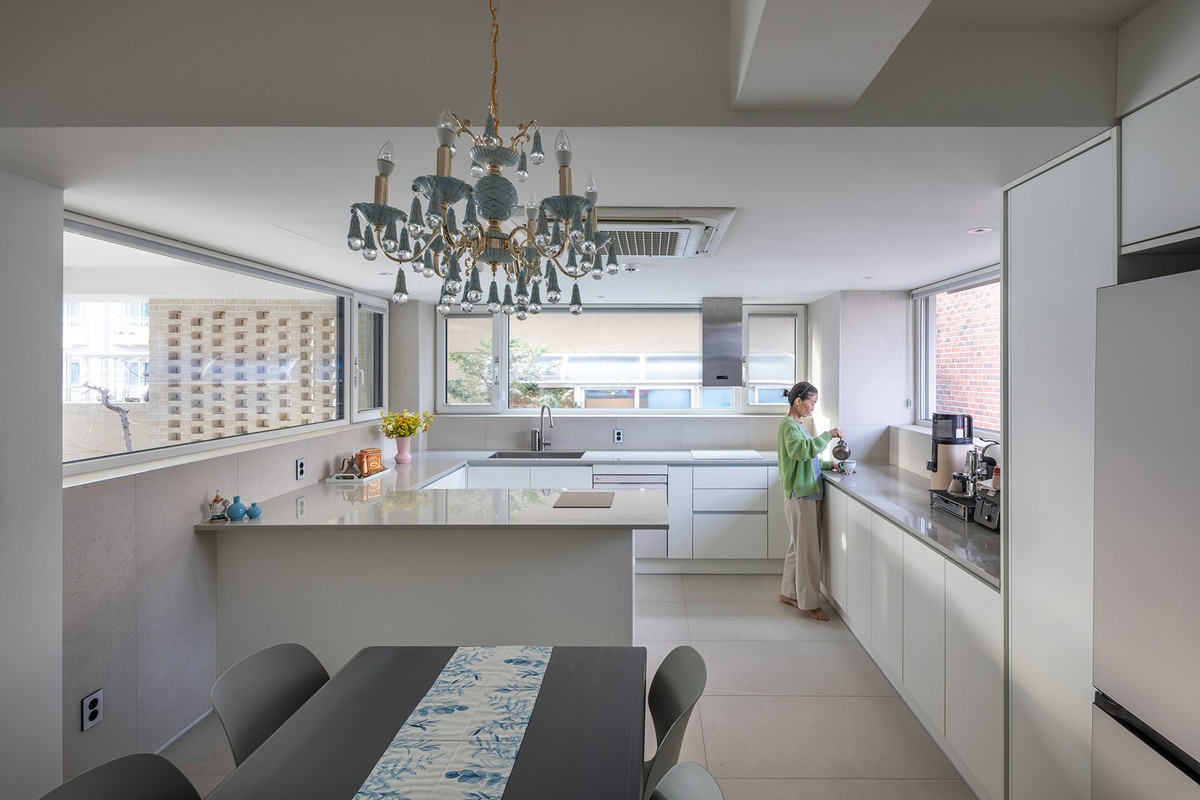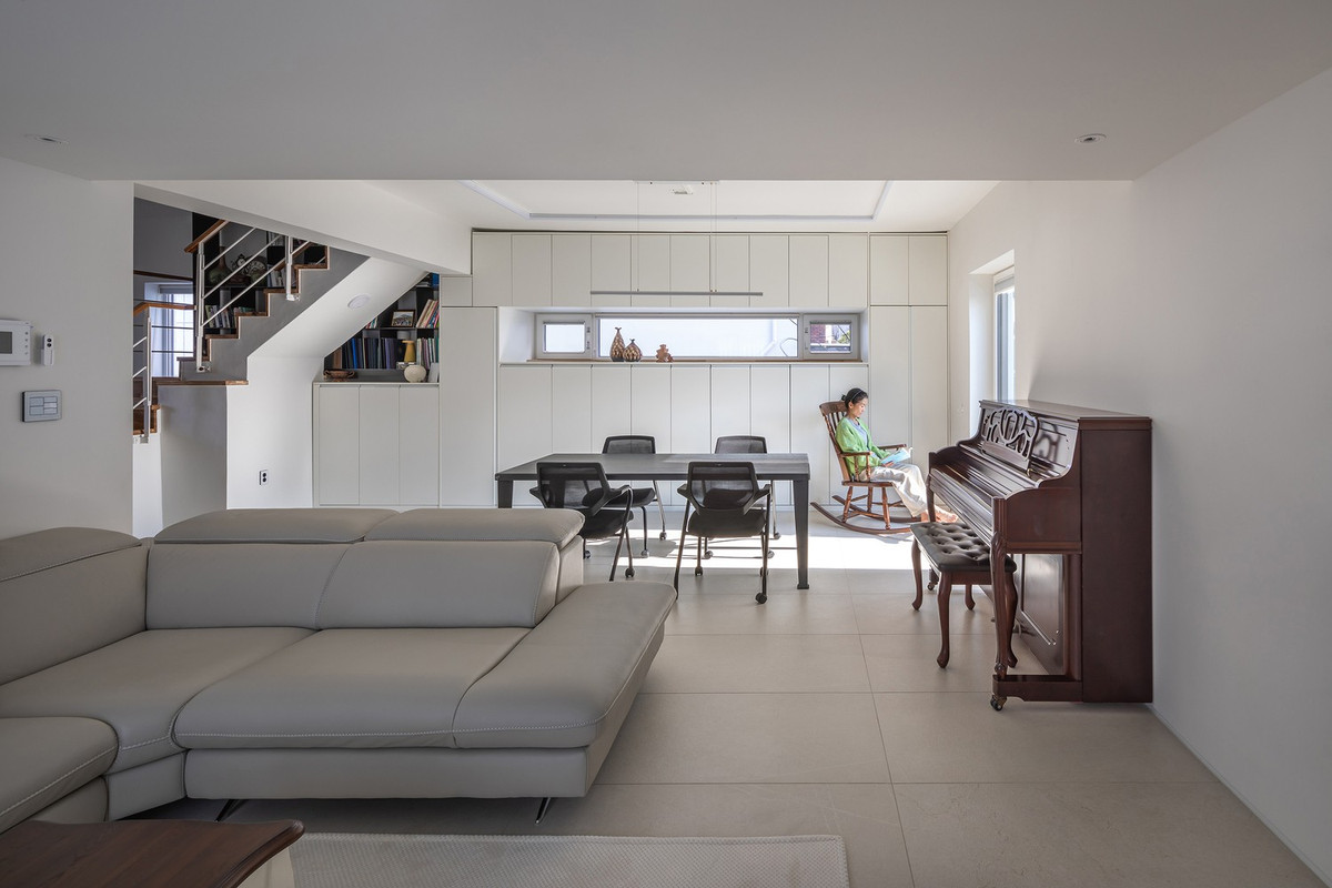 Do không đủ diện tích chia thành các phòng ngủ riêng, nhóm thiết kế mở rộng tầng một, tạo sảnh đón mới và biến không gian này thành khu bếp kết hợp phòng ăn. Ảnh: Architecture Studio YEIN