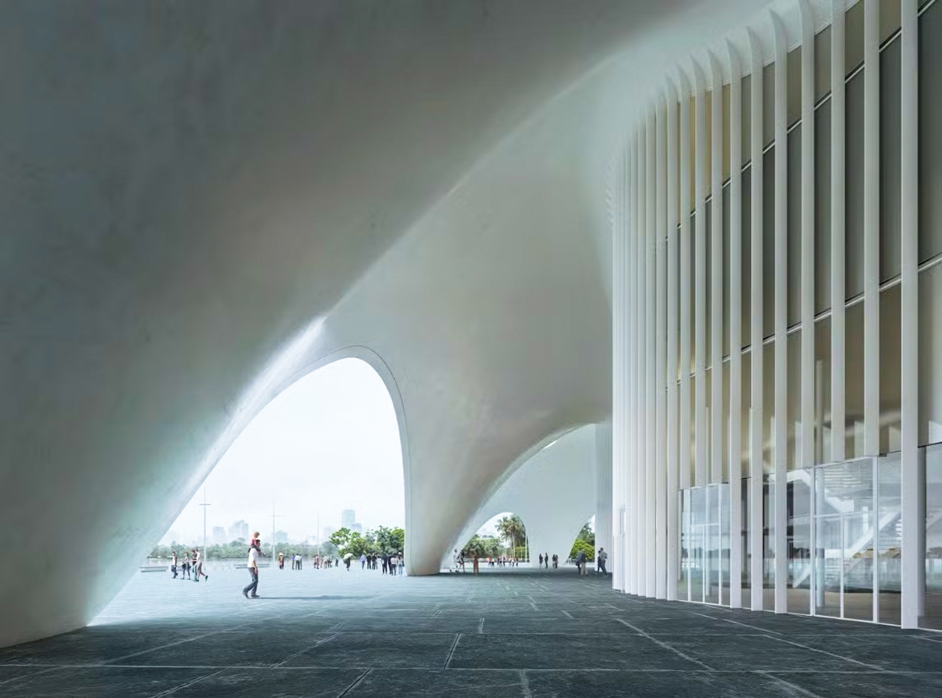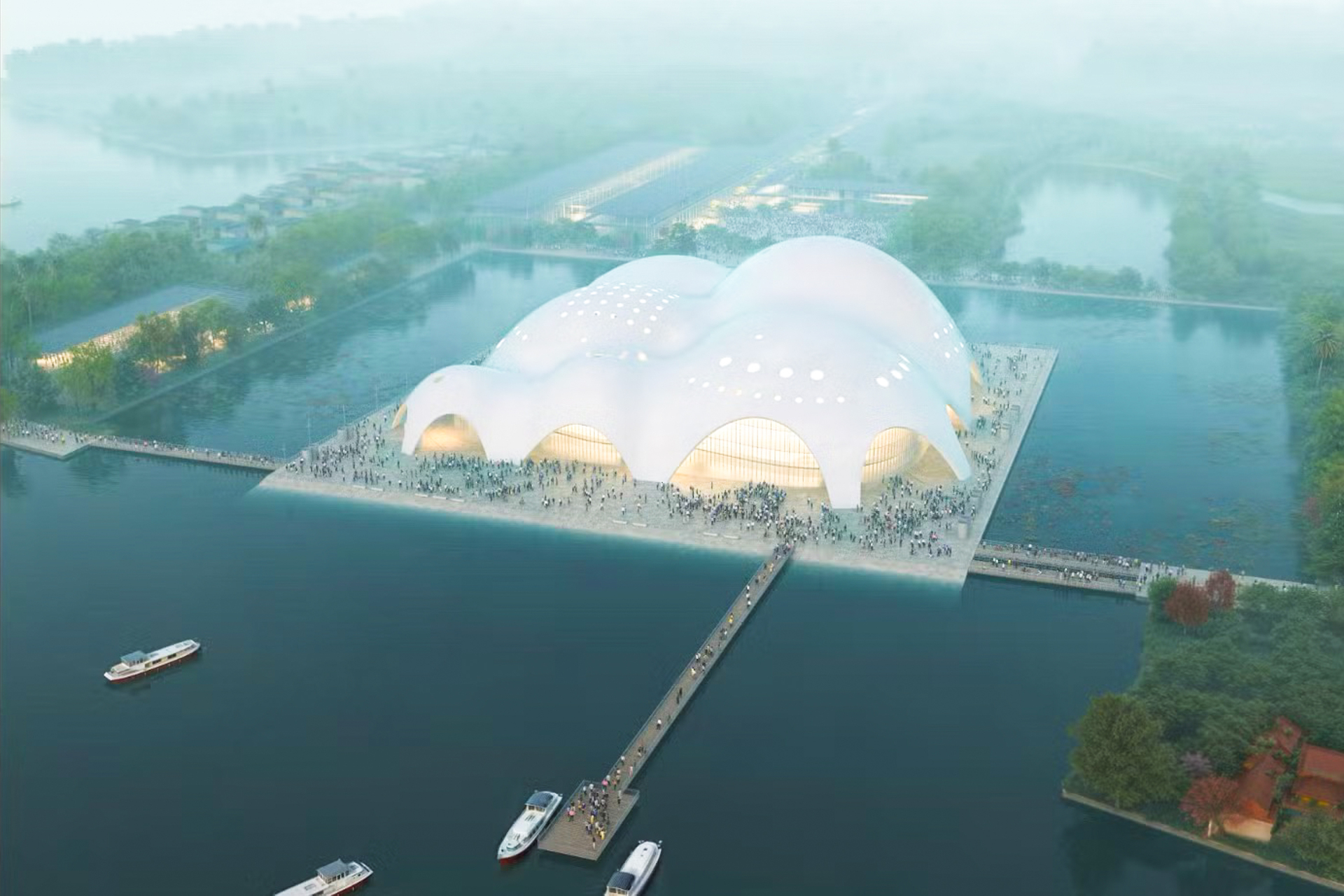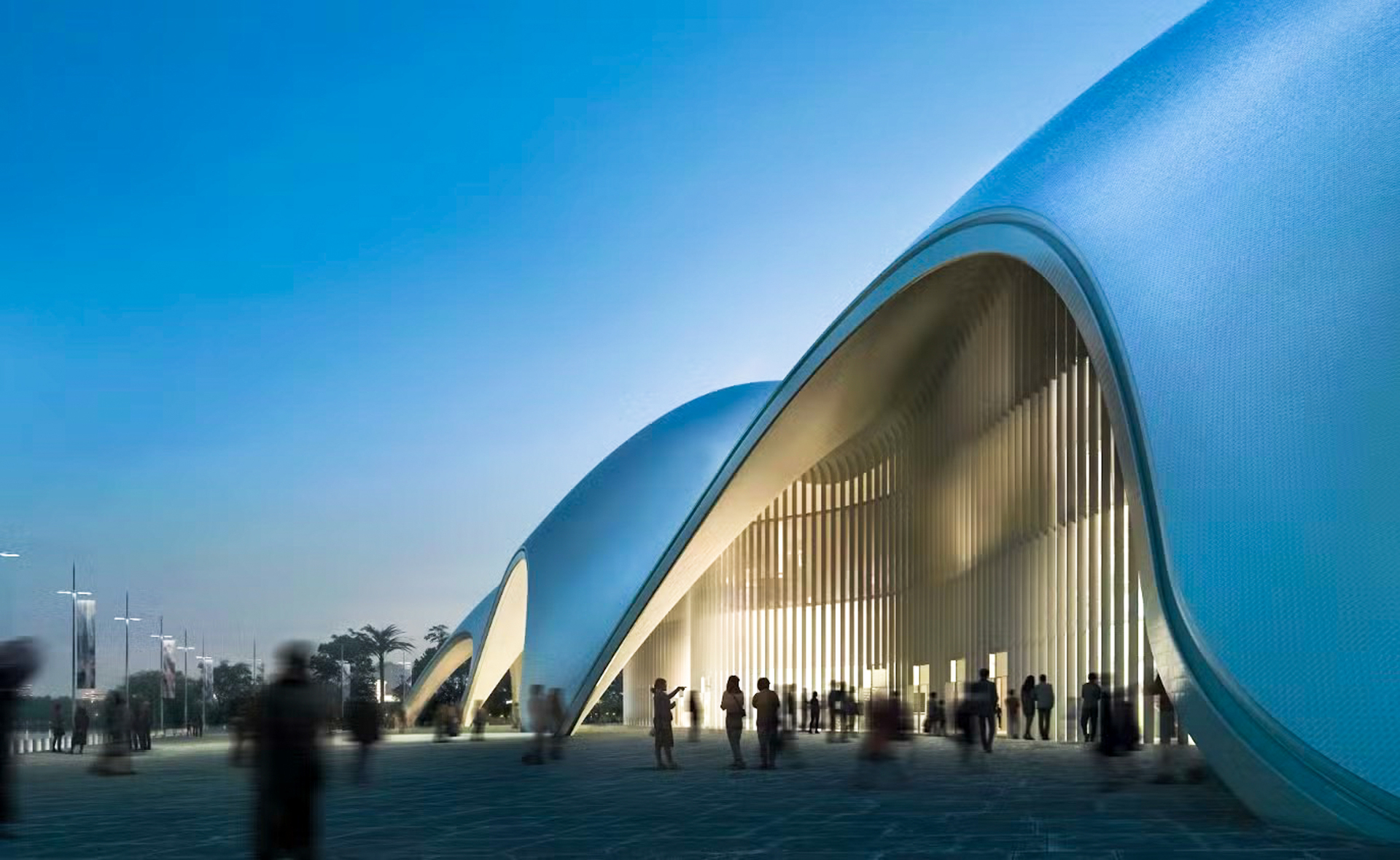 Điểm nhấn trong thiết kế của nhà hát là phần mái vòm lấy cảm hứng từ những gợn sóng của Hồ Tây. Kết cấu mái mỏng, sử dụng vật liệu có khả năng phản chiếu ánh sáng, tạo hiệu ứng thay đổi theo từng thời điểm trong ngày, góp phần tạo nên diện mạo đặc trưng cho công trình. (Trong ảnh là phối cảnh minh họa của nhà hát Opera)