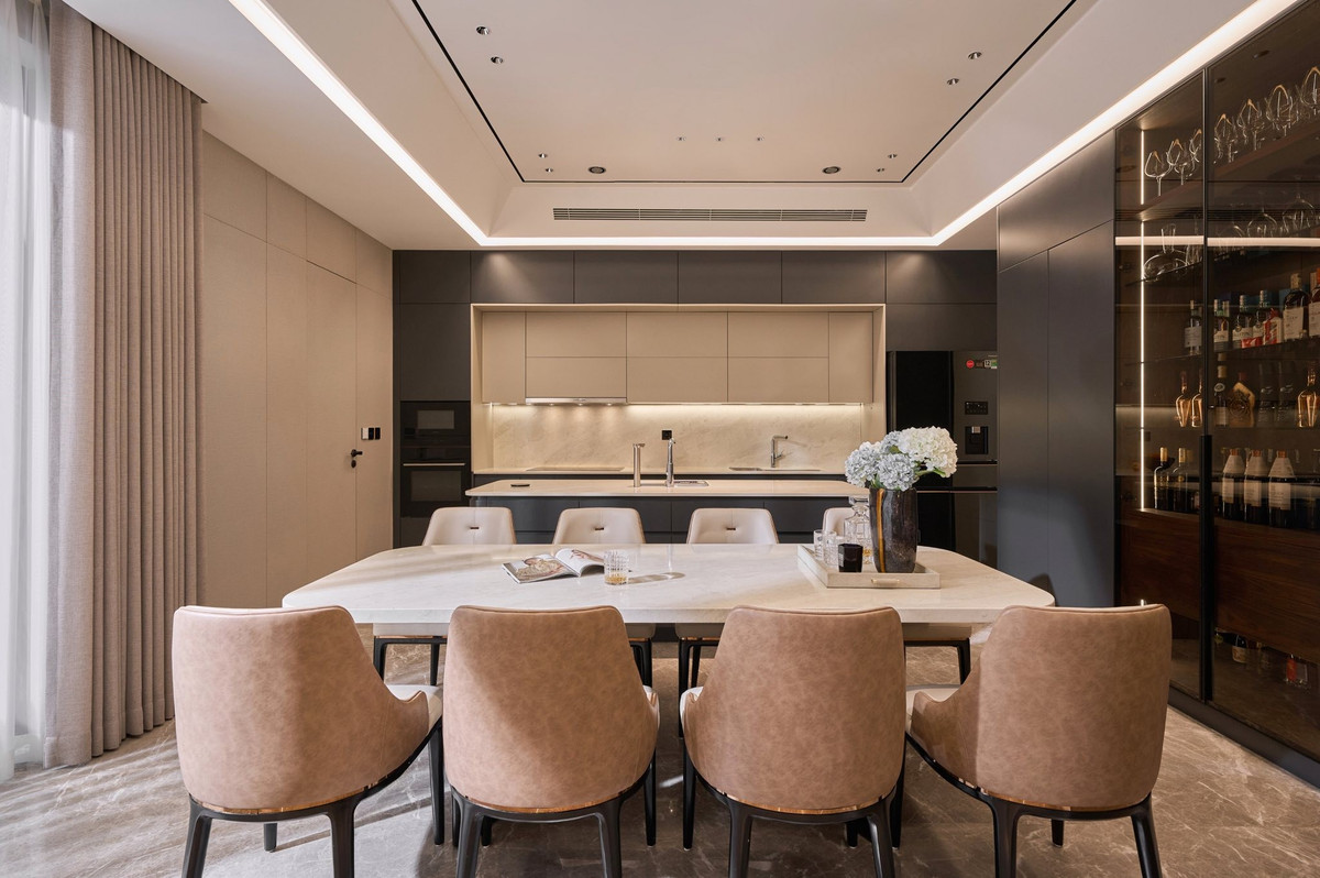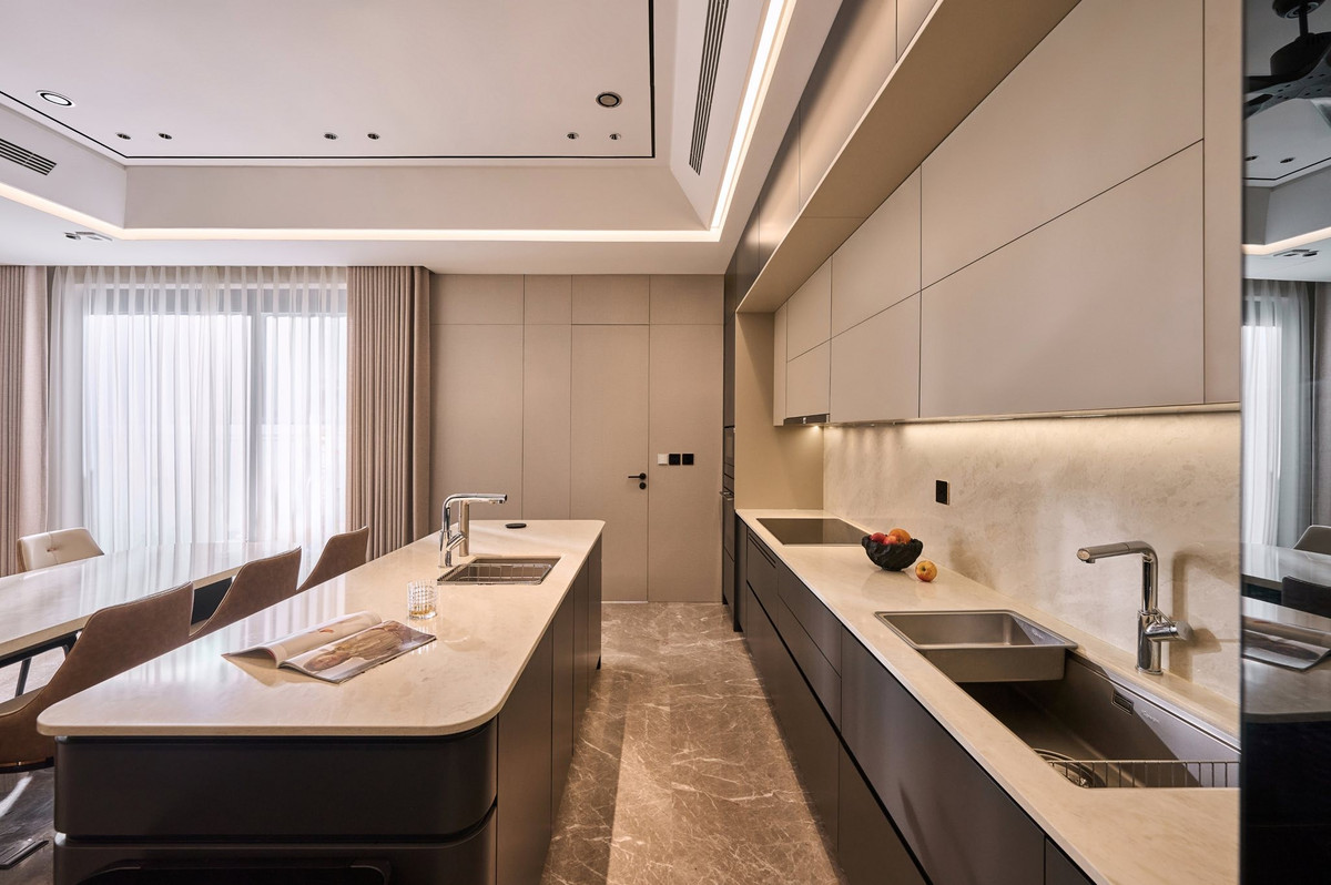 Trong khu bếp, mọi chi tiết đều thể hiện sự chỉn chu: hệ thống tủ bếp âm tường tone be - xám, thiết bị nấu nướng nhập khẩu châu Âu, mặt bếp phủ đá vân mây sang trọng. Ảnh: FB Đoàn Văn Hậu