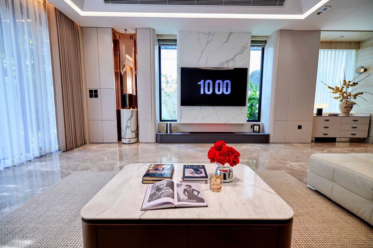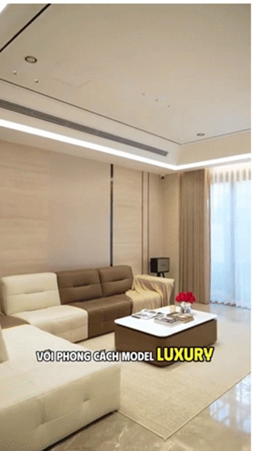 Tổ ấm mới của Đoàn Văn Hậu - Doãn Hải My nằm trong một khu đô thị cao cấp ở Hà Nội, có tông màu trắng xám vàng chủ đạo. Phòng khách nổi bật với đá vân xám cá tính, mang lại cảm giác vừa chill chill để thư giãn, nhưng vẫn toát lên sự đẳng cấp. Ảnh: FB Đoàn Văn Hậu