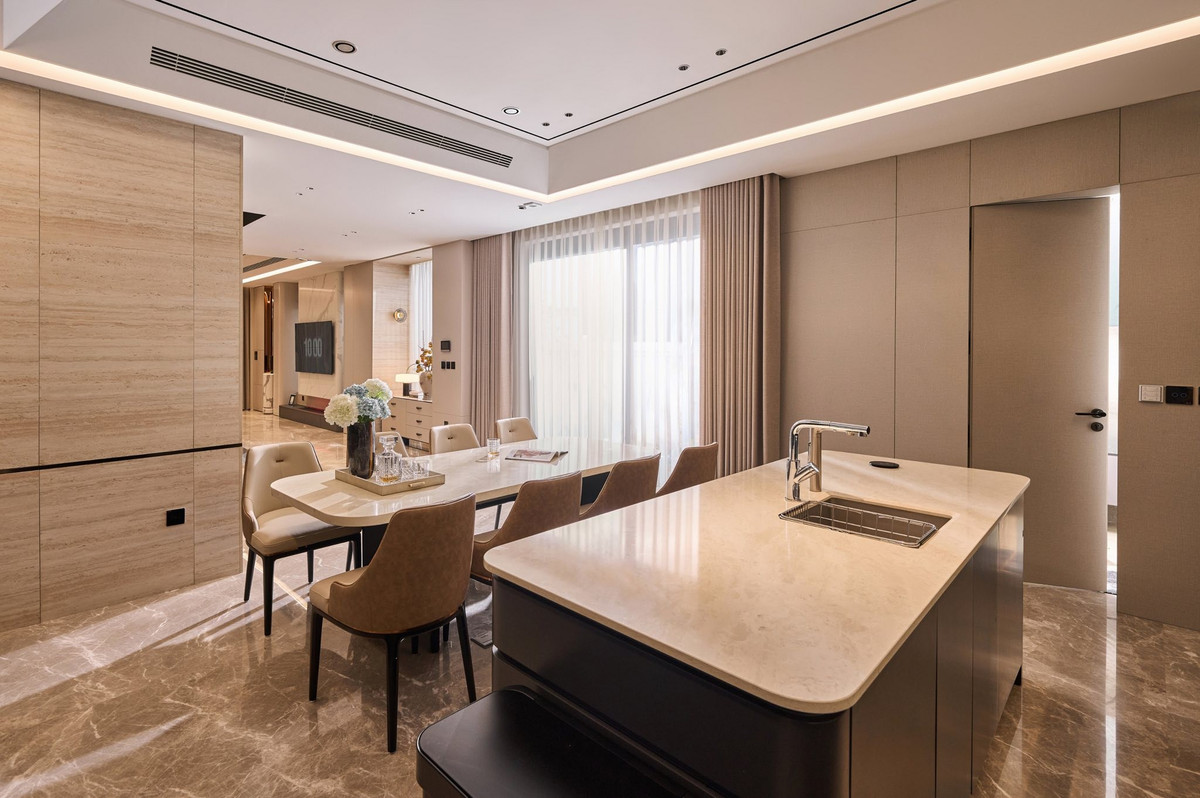 Khu bếp có tông kem chủ đạo, với đường vân đá chìm trải dài, nâng tầm không gian bếp. Nhờ đó căn bếp trông vừa sang trọng, sạch sẽ, tinh tế. Ảnh: FB Đoàn Văn Hậu