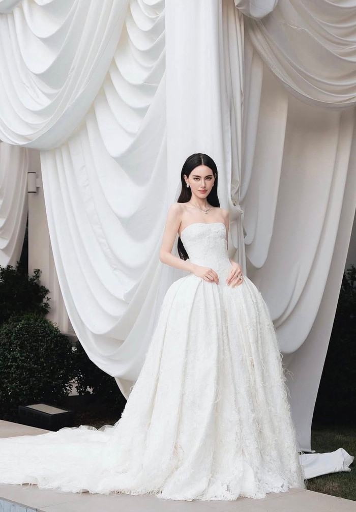 Trong không gian ngập tràn sắc trắng, Mai Davika xuất hiện với diện mạo được ví như nàng thơ bước ra từ cổ tích. Cô diện váy cưới cúp ngực thanh lịch, ôm gọn vòng eo nhỏ nhắn, cùng phần đuôi váy dài mềm mại và lớp voan phủ nhẹ phía sau. Bộ trang phục được thiết kế tinh xảo, tôn lên làn da trắng mịn và bờ vai mảnh mai chiếm trọn ánh nhìn trong mọi khung hình.