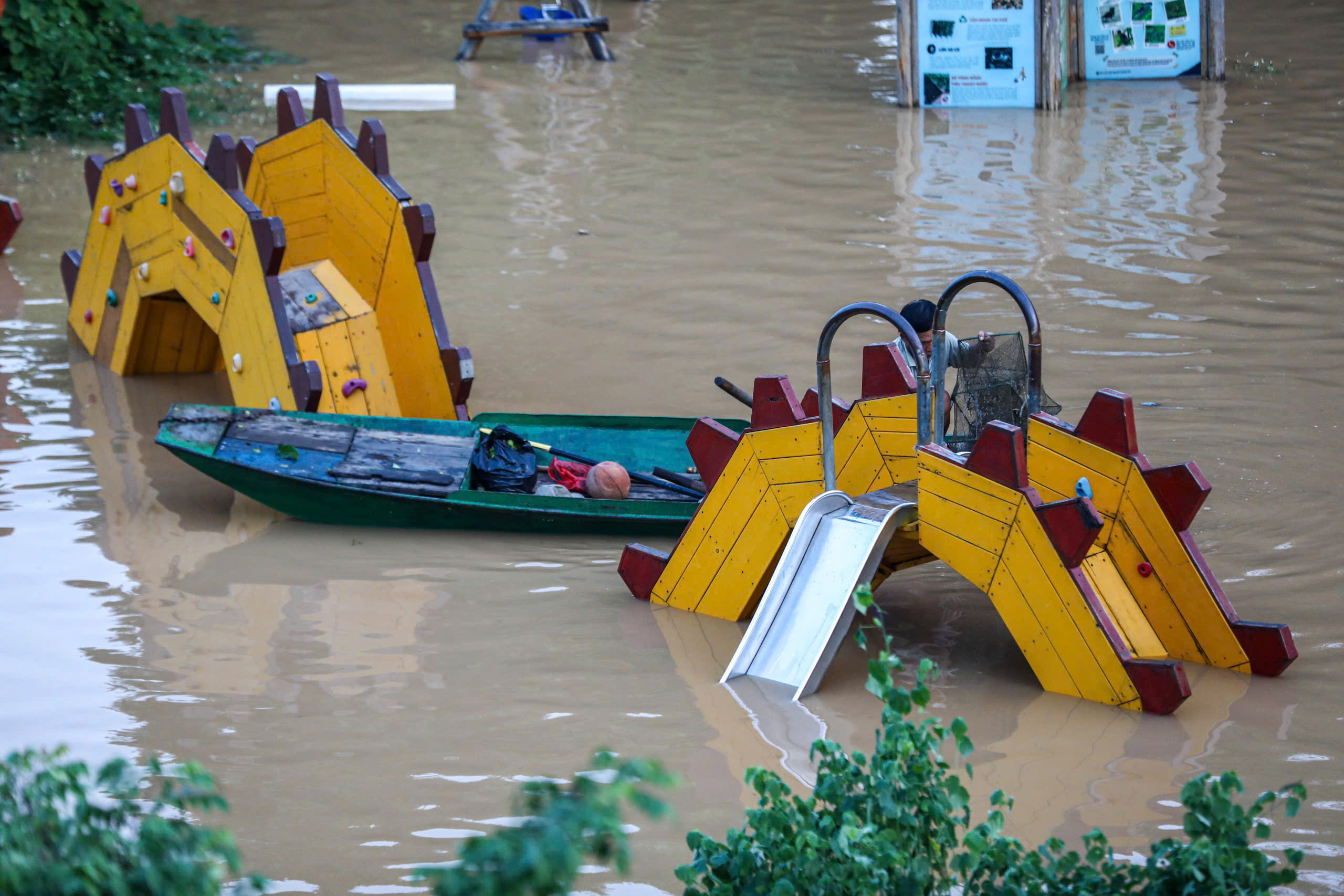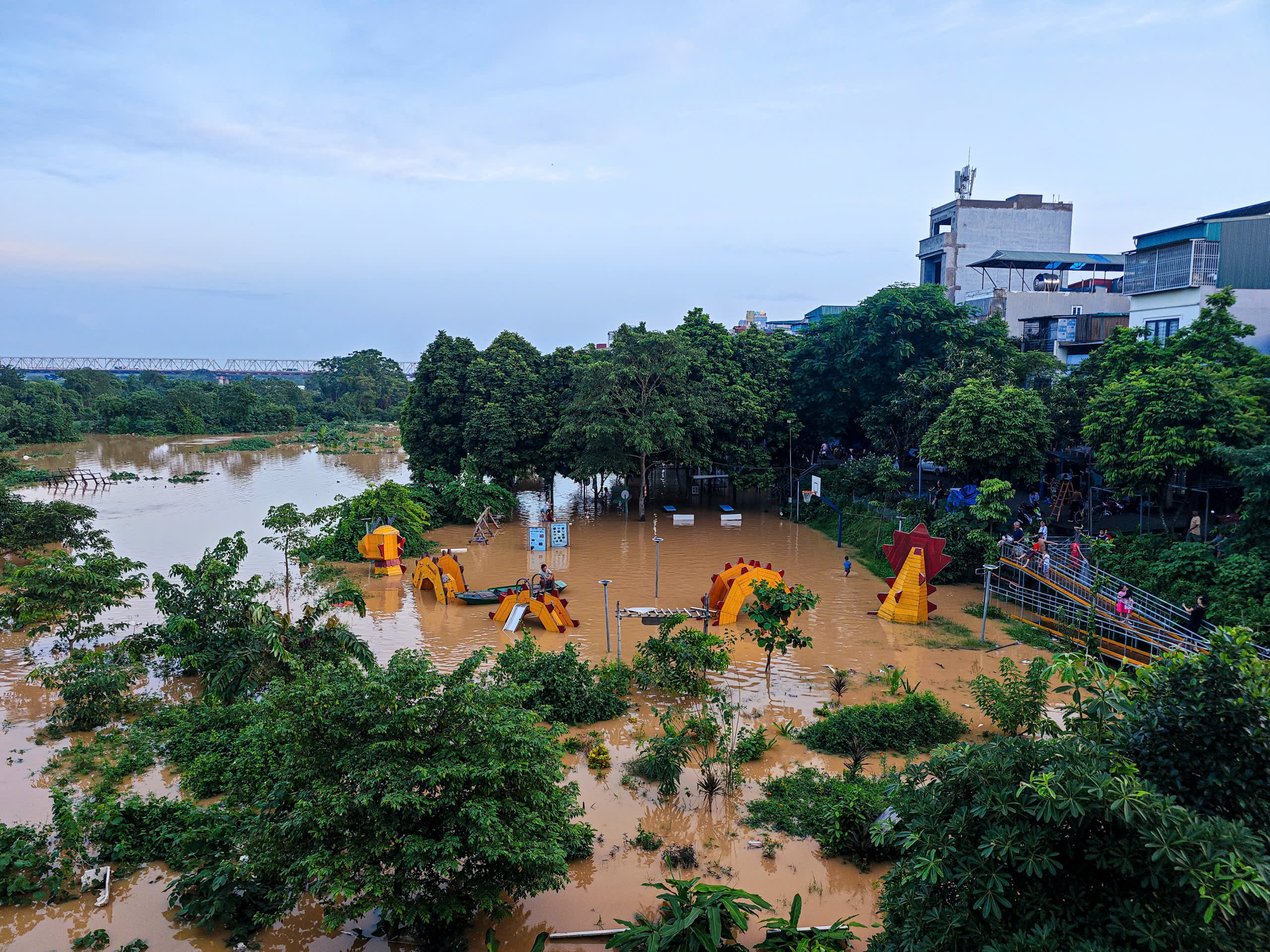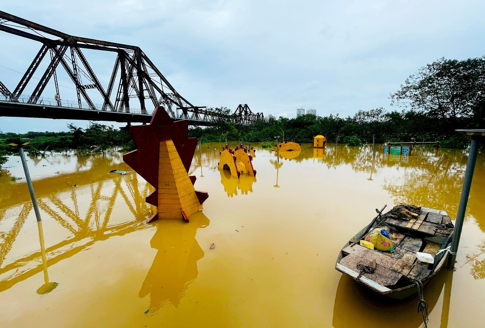 Khu vui chơi dưới chân cầu Long Biên chìm trong nước lũ