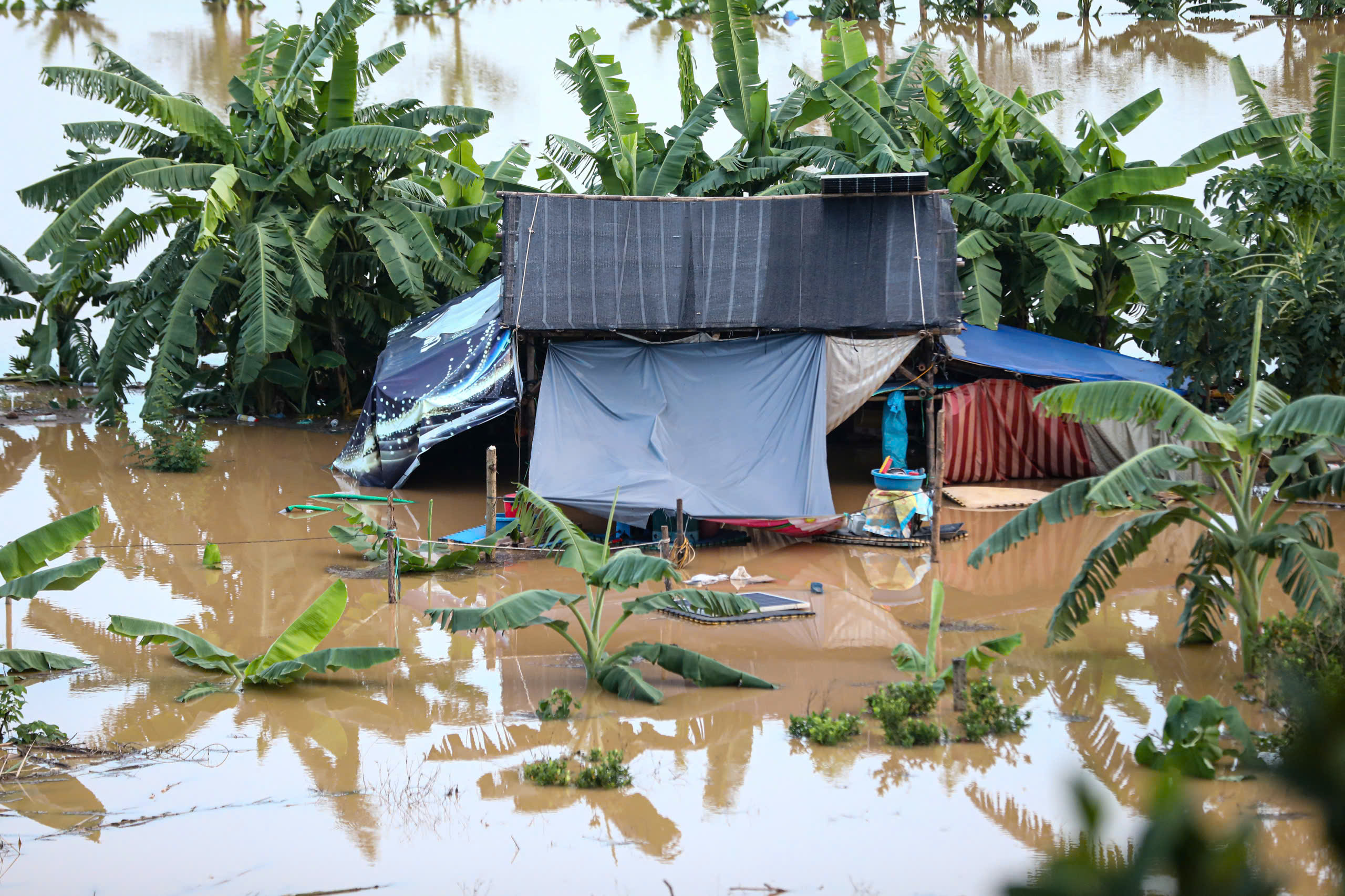 Khu dân cư sát chân cầu, gần chợ Long Biên trong cảnh ngập sâu, nước dâng gần sát mái nhà. Nhiều người dân tại đây đã phải tạm thời di chuyển đi chỗ khác...