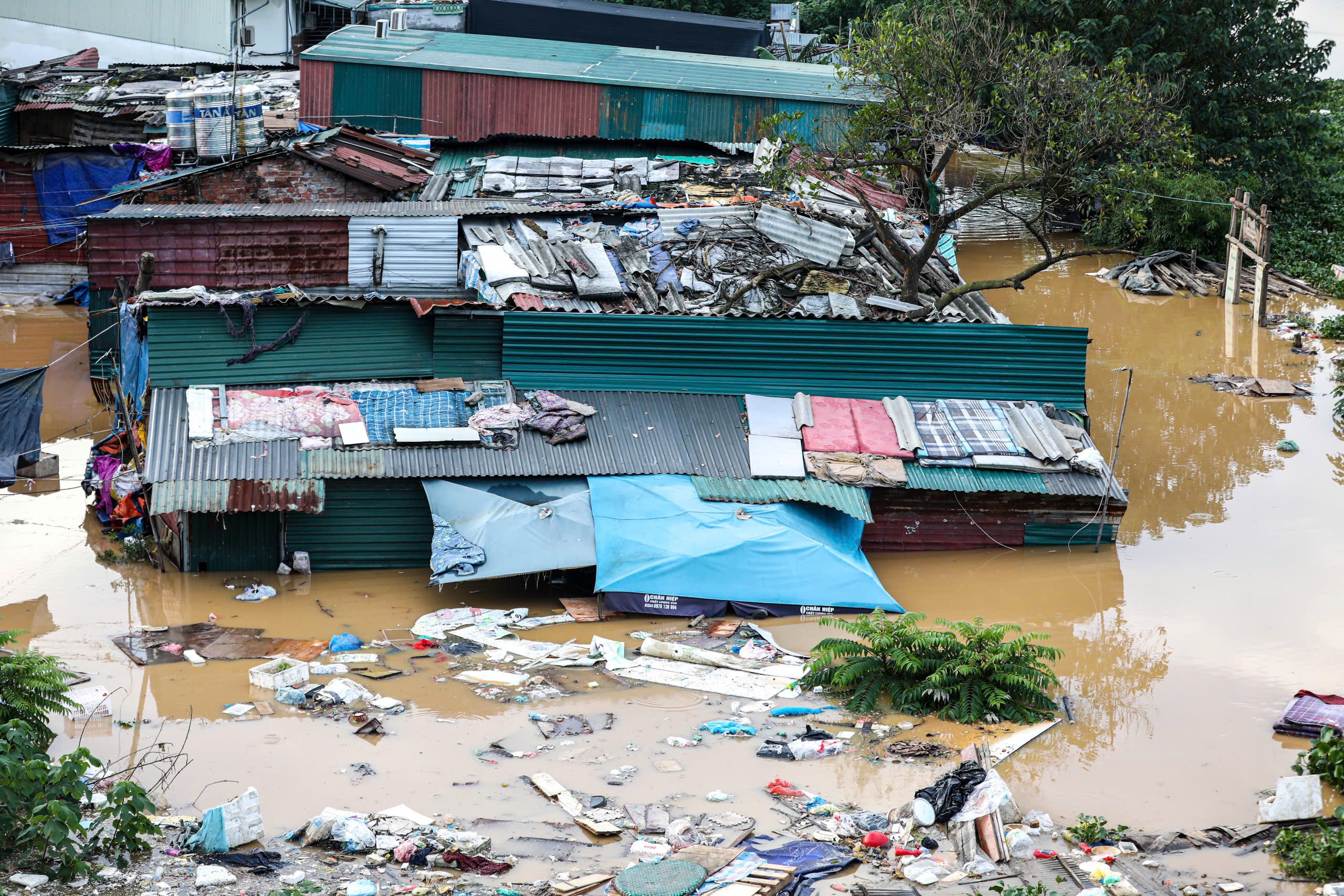 Toàn cảnh khu dân cư dưới chân cầu Long Biên, dù hôm nay ở Hà Nội đã hết mưa, trời nắng ráo nhưng khu vực này vẫn ngập sâu dưới nước
