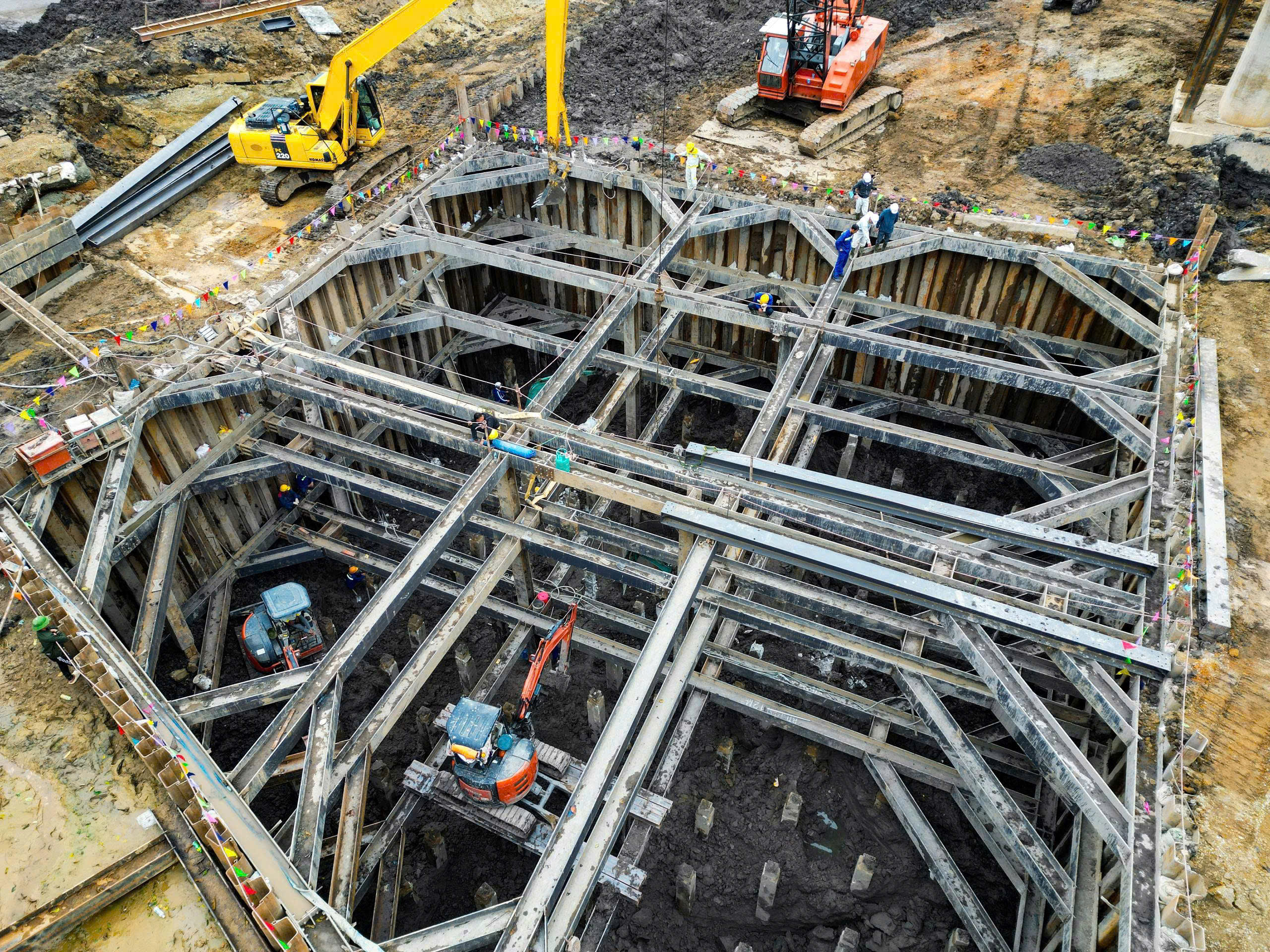 Công trường thi công nhộn nhịp máy móc, hệ thống khung sắt để làm hầm chui.
