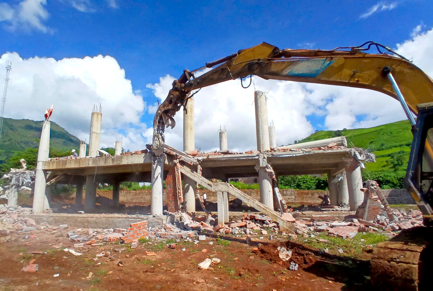 Công nhân tháo dỡ, phá bỏ công trình bằng bê tông của huyện Chư Păh (cũ).