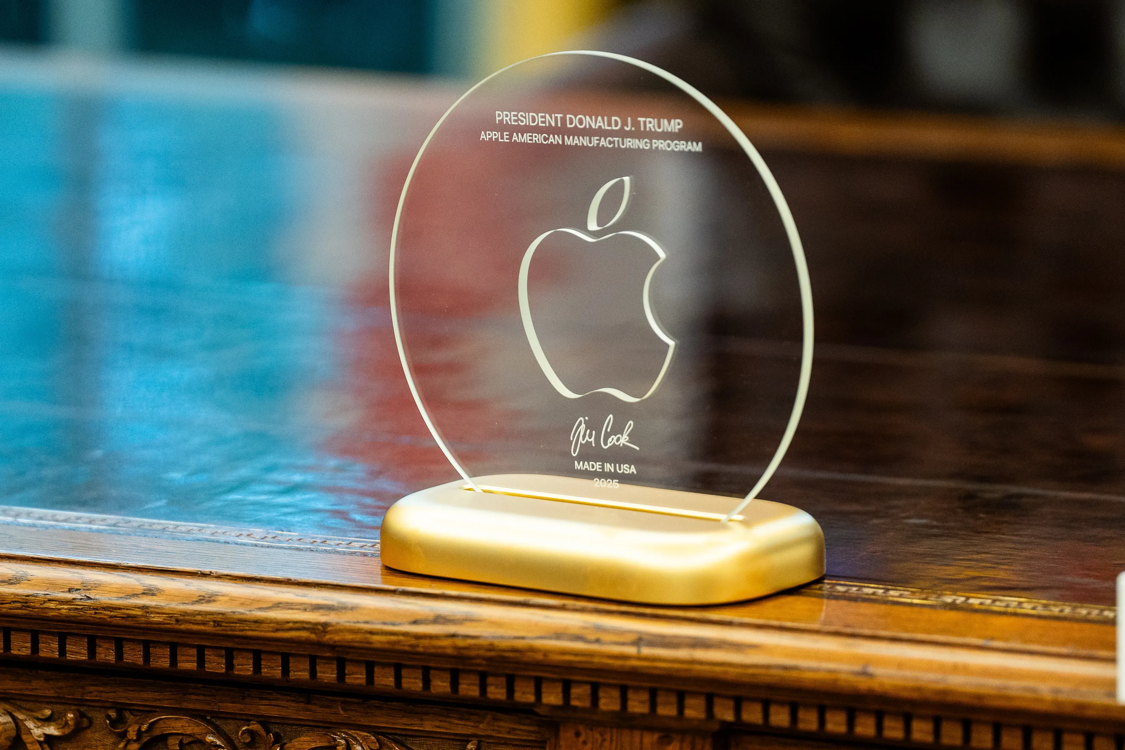 CEO Apple Tim Cook tặng quà cho Tổng thống Trump tại Phòng Bầu Dục của Nhà Trắng ngày 6/8/2025, sau khi công bố khoản đầu tư 100 tỷ USD vào các dự án. Ảnh: The Washington Post