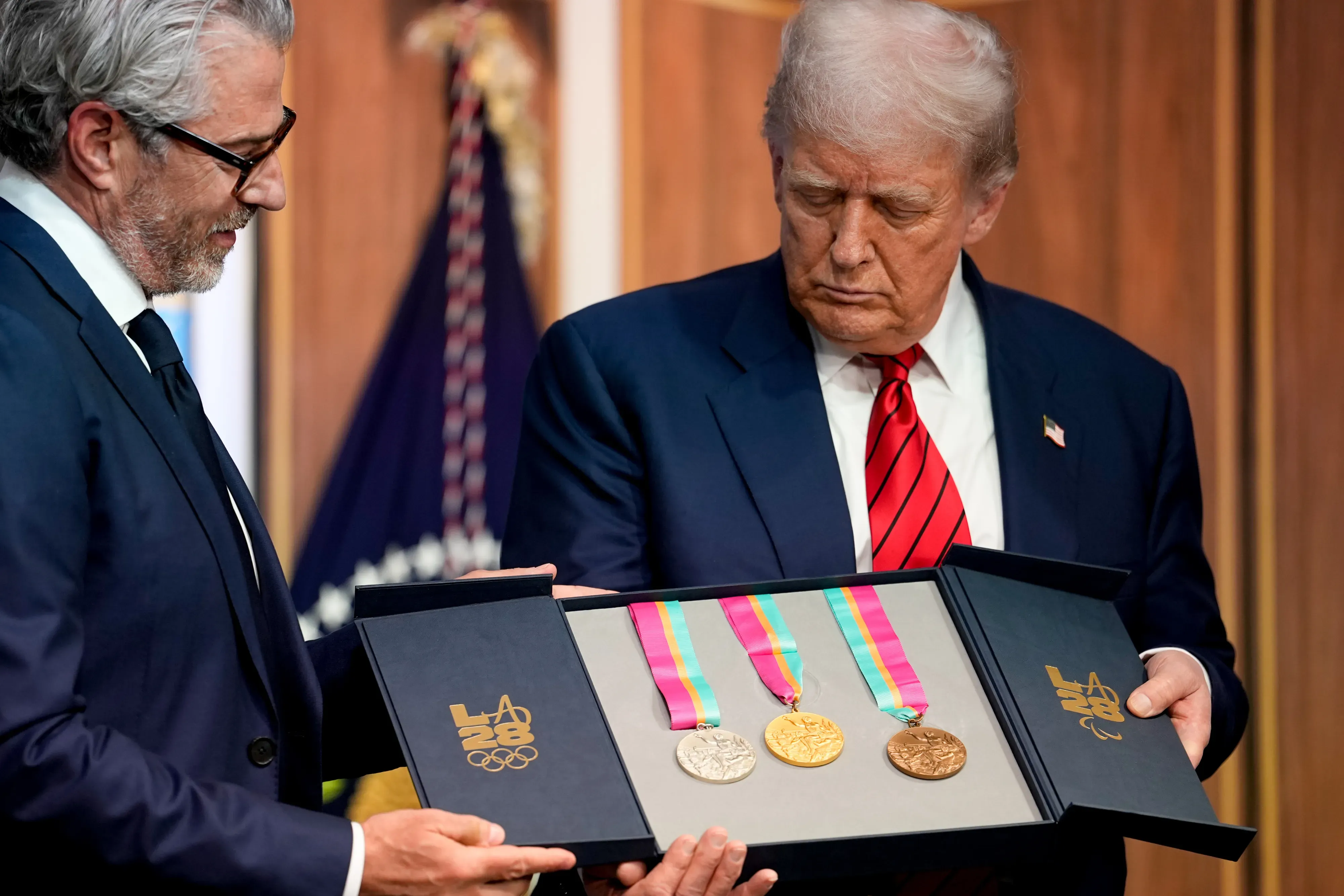 Chủ tịch Ủy ban tổ chức Olympic LA 2028 Casey Wasserman tặng Tổng thống Trump một bộ huy chương Olympic tại Nhà Trắng ngày 5/8/2025. Ảnh: Bloomber
