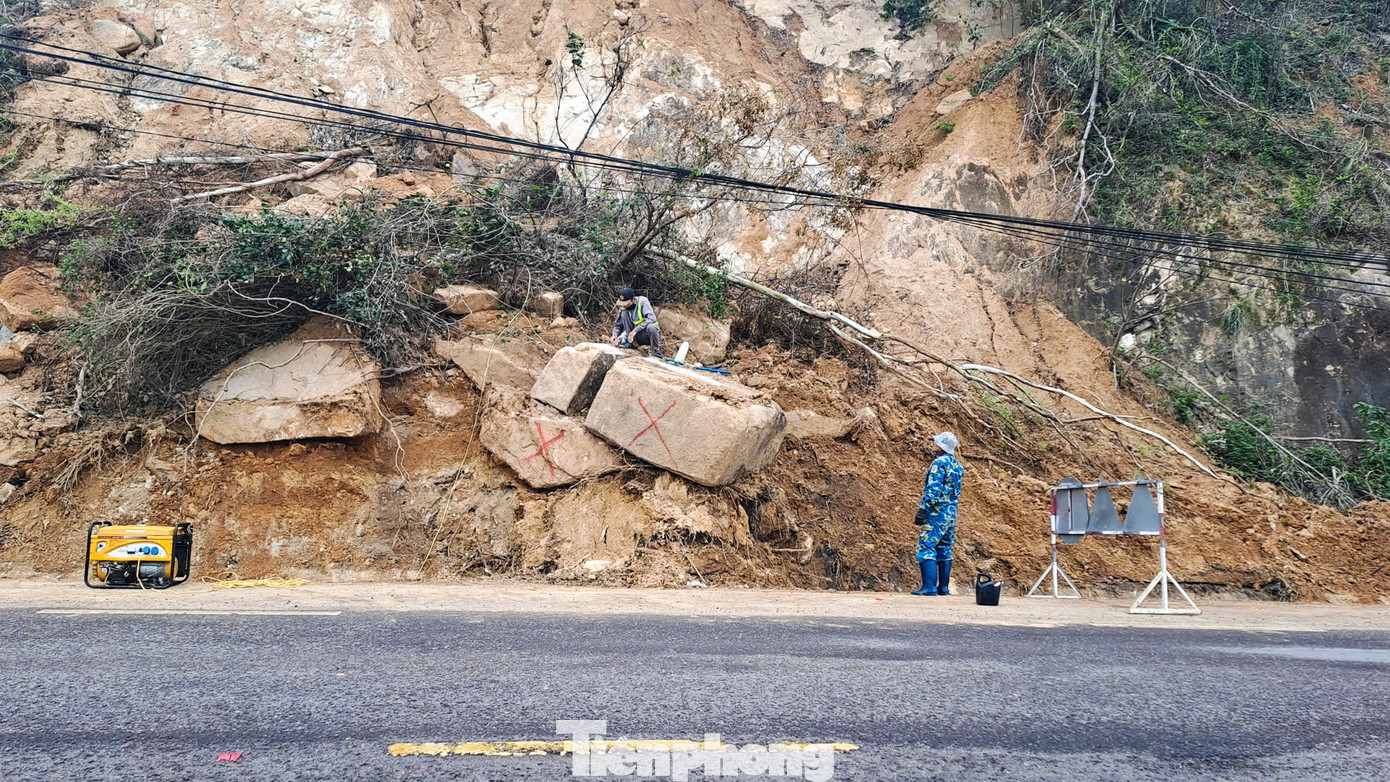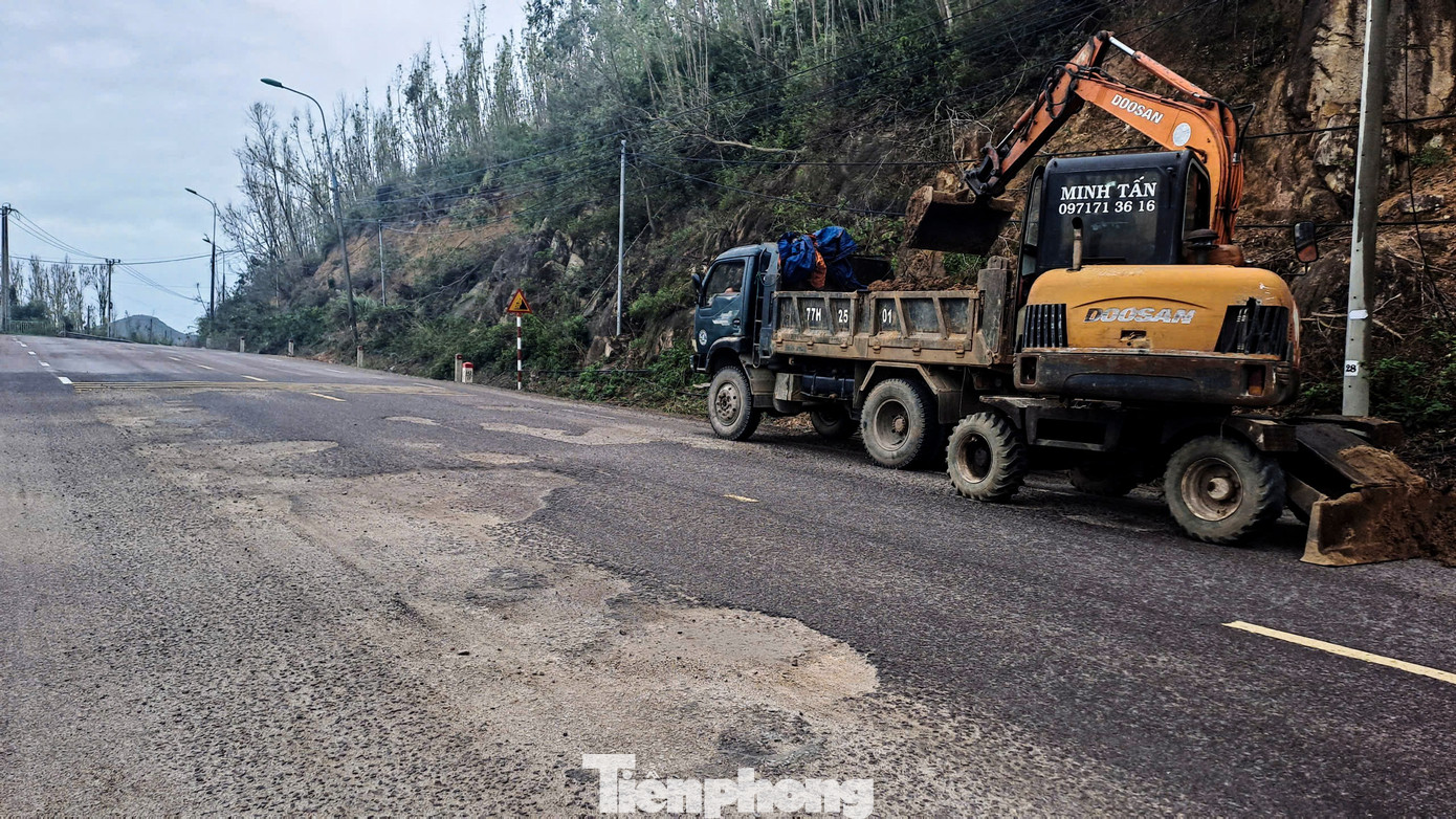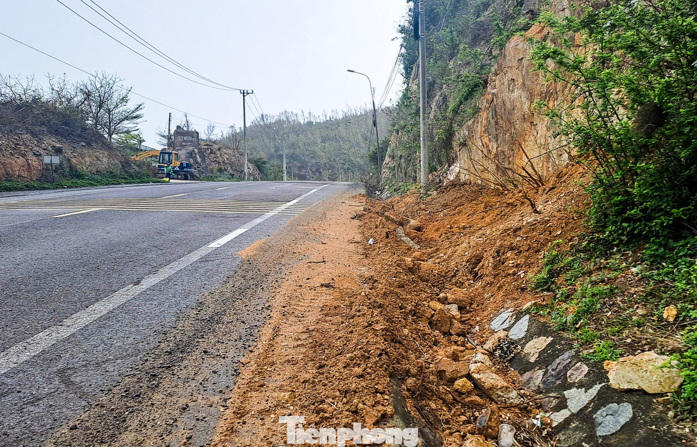 Không chỉ nền đường hư hỏng, ghi nhận trên tuyến 1D có nhiều điểm sạt lở đất đá, hiện nay các đơn vị cũng đang tiến hành khắc phục. Ảnh: Trương Định.