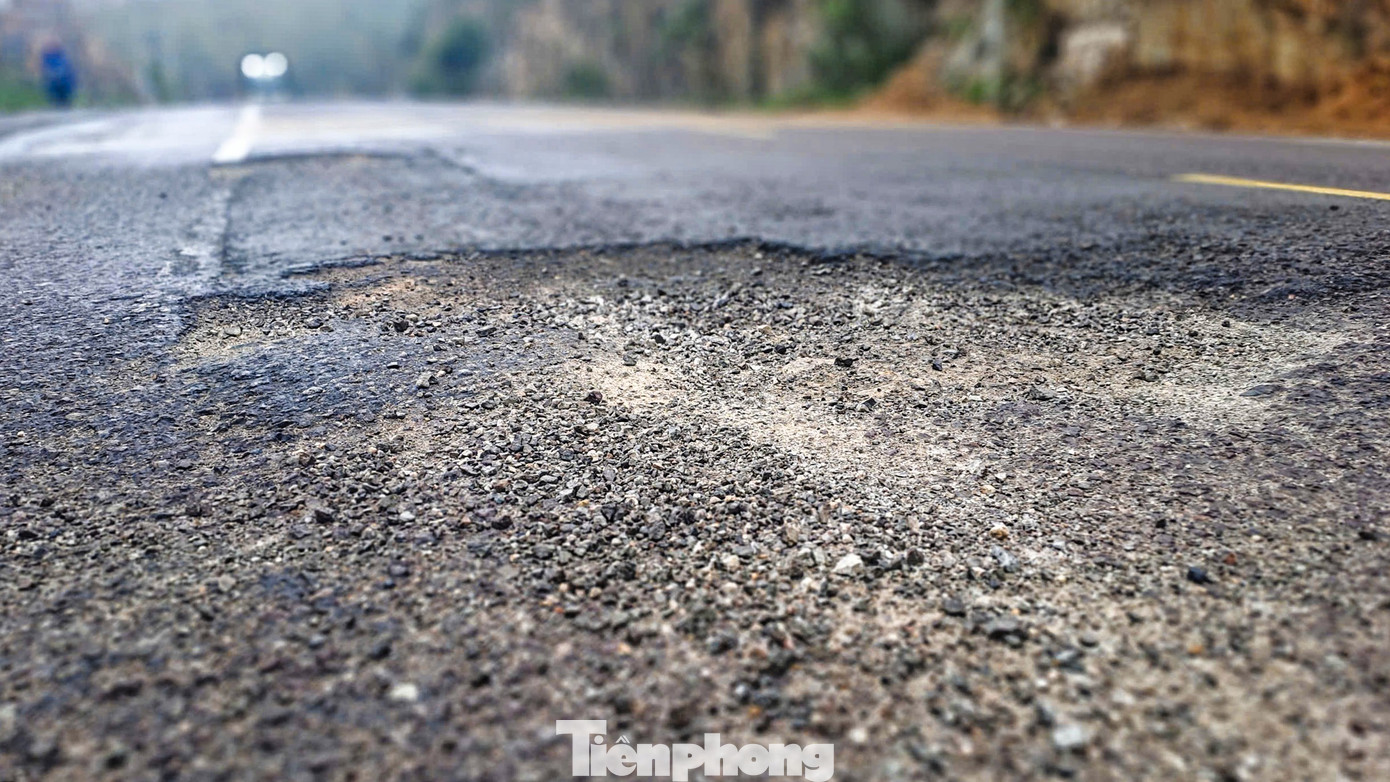Mặt đường lồi lõm, tạo thành hố sâu khiến các phương tiện dễ trượt ngã, đặc biệt khi mưa lớn, ban đêm tầm nhìn bị hạn chế. Ảnh: Trương Định.