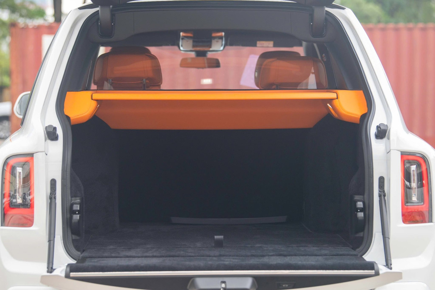 Bên trong cabin, chiếc Rolls-Royce Cullinan Black Badge 2025 sở hữu nội thất được bọc da màu cam Hermes kết hợp với một số chi tiết được ốp carbon.