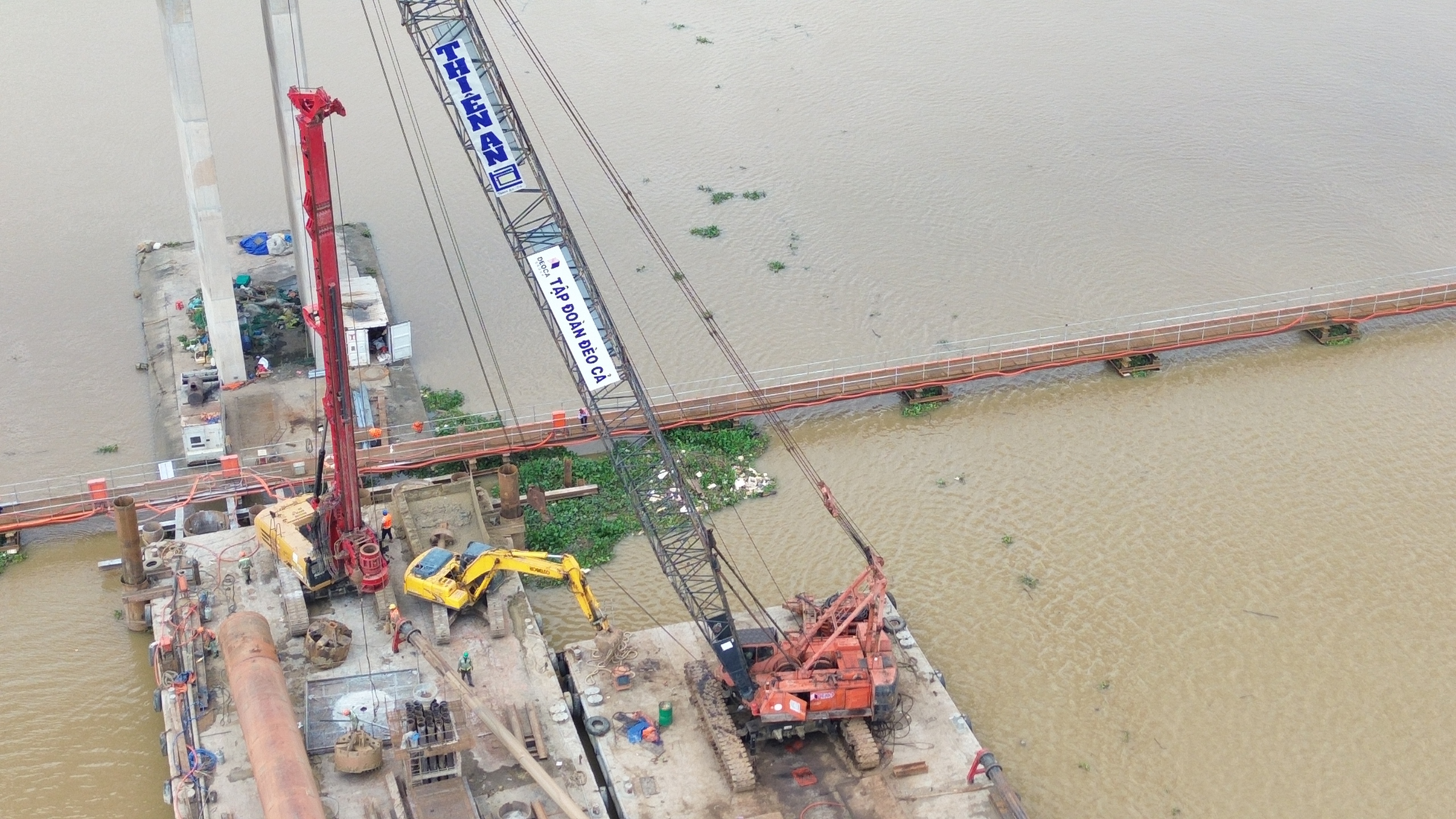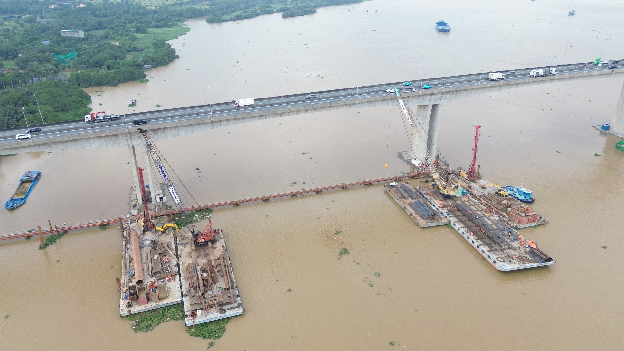Những ngày này trên công trường thi công cầu Long Thành dù đang trong cao điểm mưa, bão nhưng không khí thi công với nhịp độ khẩn trương cả trên bờ và dưới sông Đồng Nai.
