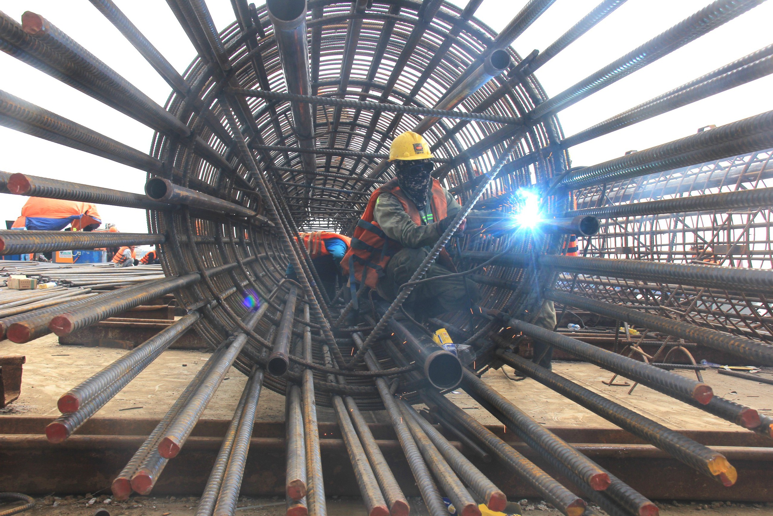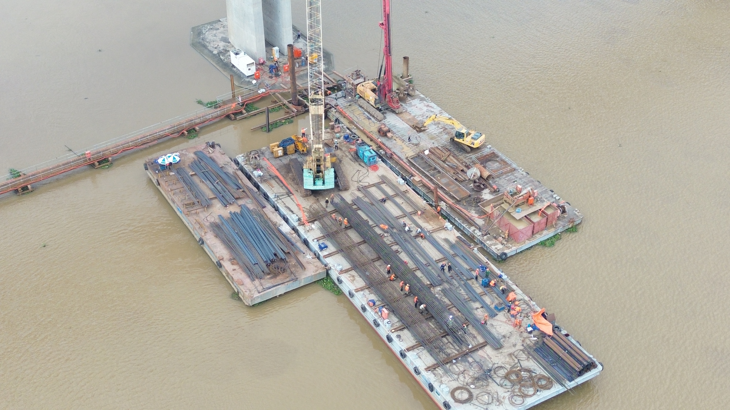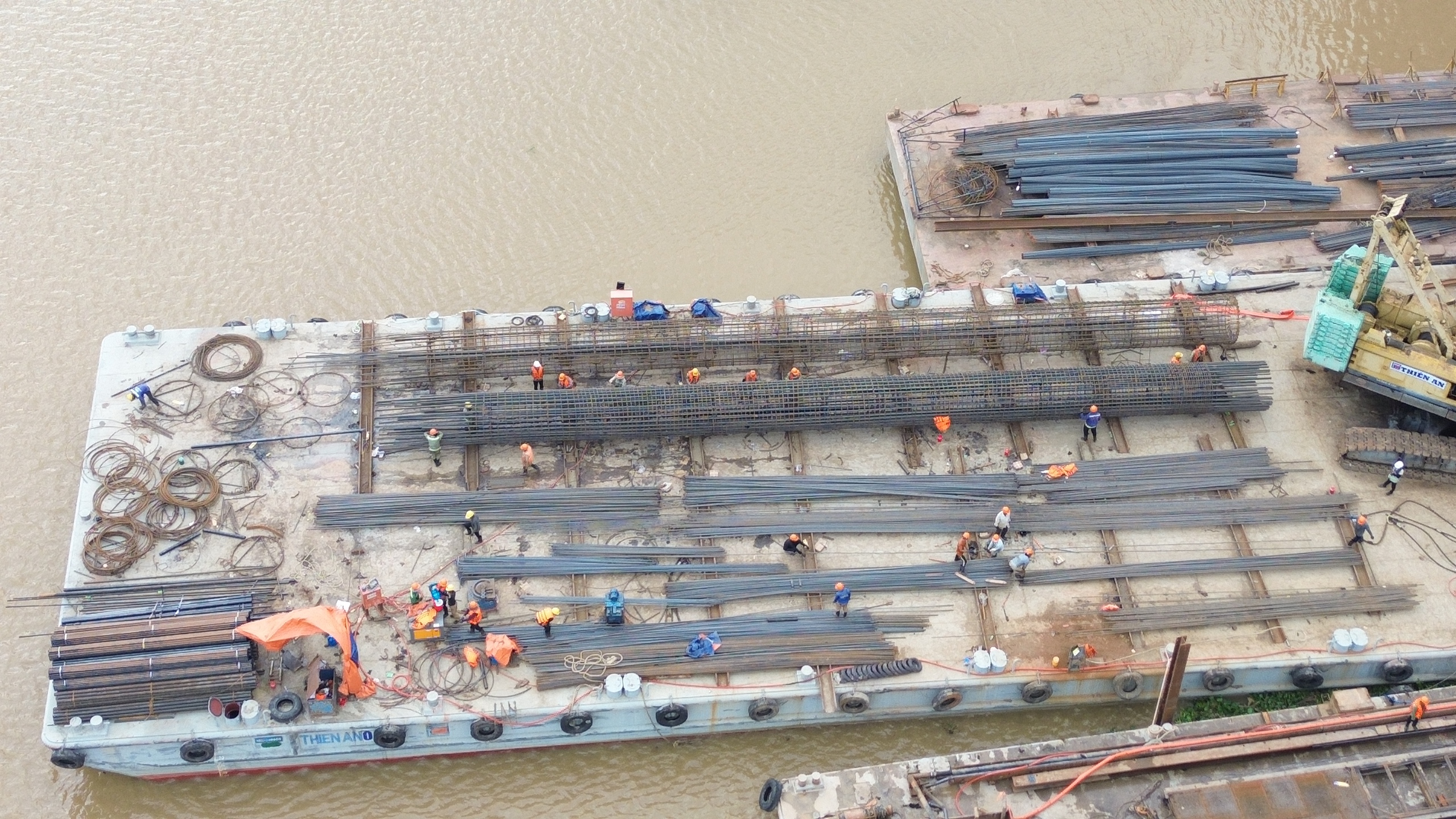 Theo ghi nhận của PV Báo Xây dựng trên công trường, hàng trăm công nhân đang gấp rút đan các lồng sắt ngay trên sà lan để sớm khoan cọc khoan nhồi giữa sông. Hơn nữa công địa chật hẹp, đường công vụ khó khăn, nhà thầu đã có giải pháp táo bạo để bám sát tiến độ đề ra.
