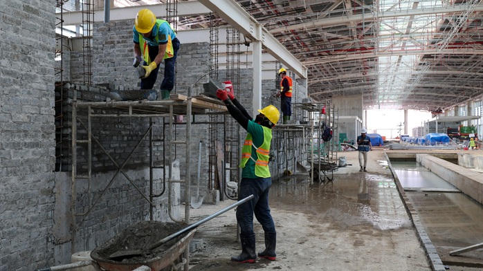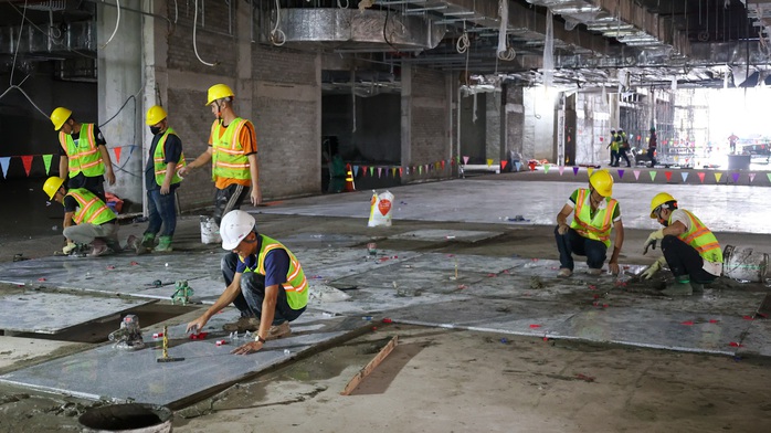 Công nhân đang thi công lát sàn tại nhà ga hành khách