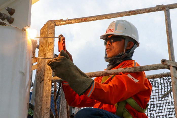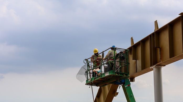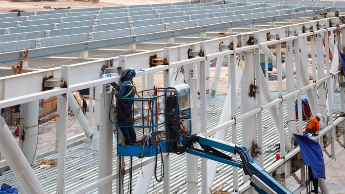 Người lao động cắt kết cấu thép để lắp đặt tại nhà ga sân bay Long Thành