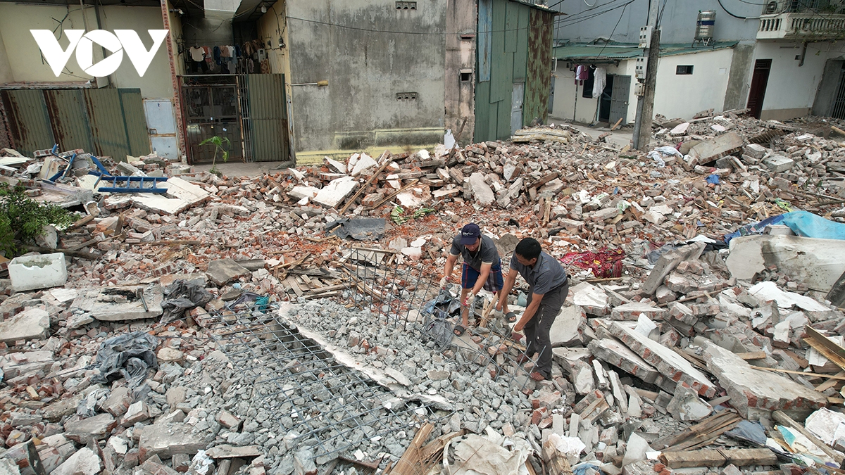 Người dân thão dỡ bê tông lấy sắt phế liệu