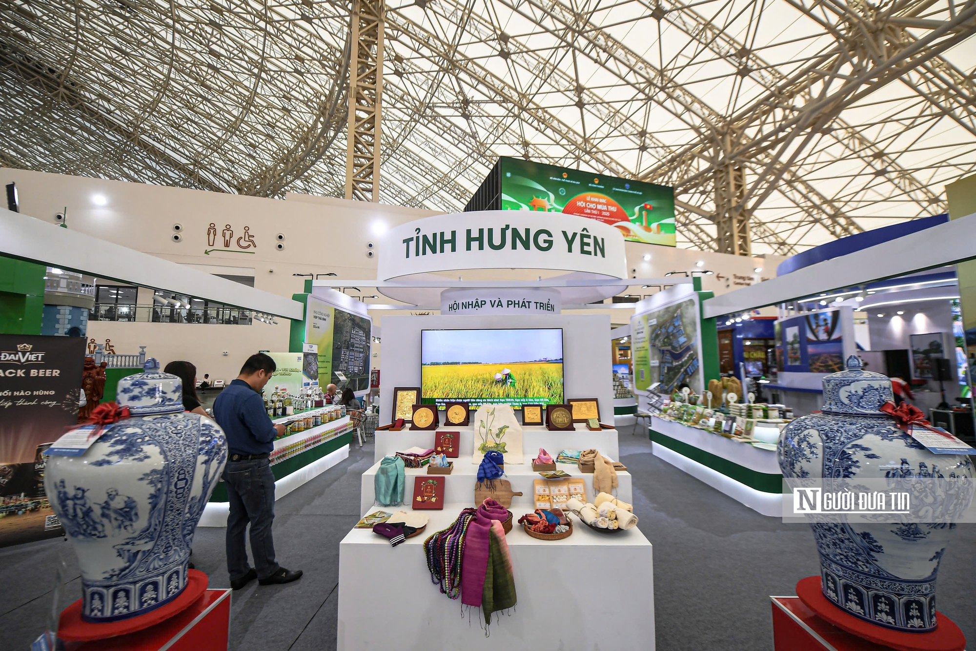 Gian trưng bày của tỉnh Hưng Yên mang thông điệp “Hội nhập và phát triển”, giới thiệu các sản phẩm nông nghiệp, làng nghề cùng mô hình OCOP tiêu biểu.